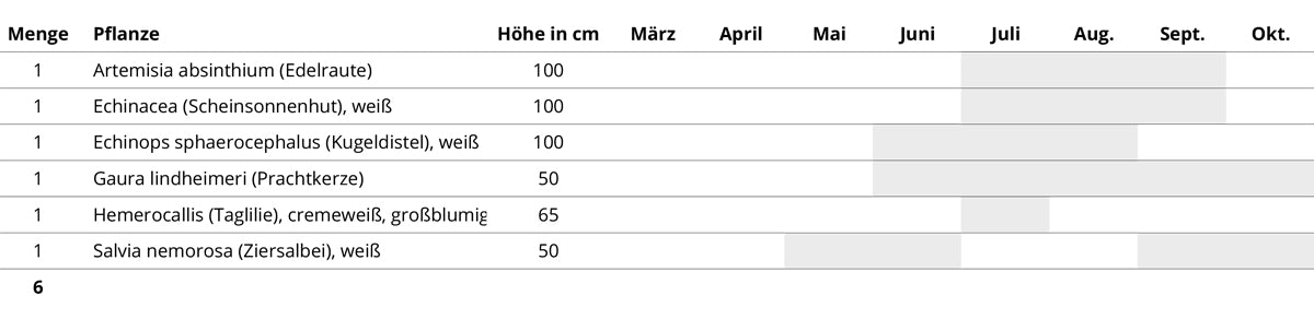 Begleitet wird die galaktische Schönheit vom feinen Silberlaub eines Wermuts (Artemisia), den großen, cremefarbenen Blüten einer unkomplizierten Taglilie, schmetterlingsgleichen Blütchen einer kompakten Prachtkerze (Gaura) sowie schneeweißem Ziersalbei (Salvia) und den sternenförmigen Blüten eines weißen Scheinsonnenhuts (Echinacea). Auch Bienen, Hummeln und Schmetterlinge lieben das Ensemble, denn Kugeldistel, Salbei, Prachtkerze und Ziersalbei sind über die Sommermonate wahre Nektarbrunnen.