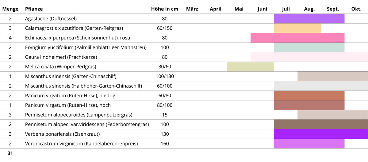 Für weitere Farbtupfer sorgen ergänzende Blütenstauden, die in die Pflanzung eingestreut sind. So leuchtet von Hochsommer bis Herbst rosafarbener Purpursonnenhut zwischen den Gräserhorsten. Zart schwebt hohes Eisenkraut über allem und ergänzt sich prächtig mit hohem Kandelaber-Ehrenpreis. Weiße Blütchen breitet die zartstängelige Prachtkerze ab Juni aus und blüht unermüdlich bis in den November. Für einen Hauch Extravaganz sorgt eine Edeldistel mit ihren silbergrauen Blütenkugeln, die sich auf langen Stängeln über den Gräsern erheben. Zwei aromatische Duftnesseln runden das Ensemble mit violetten Kerzenblüten ab. Und das Beste an dieser Pflanzenkomposition? Sie ist trotz Pflegeleichtigkeit auch insektenfreundlich, denn alle Blütenstauden bieten sowohl Bienen als auch Hummeln und Faltern viel Nektar.
