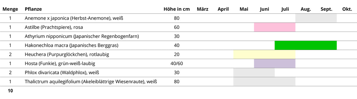 Für ultimative japanische Eleganz sorgen im Hintergrund eine weiße Wiesenraute mit pomponartigen Blüten auf hohen Stielen sowie eine schneeweiße Herbst-Anemone, die feierlich das Gartenjahr beschließt. Haben sich alle Pflanzen zur Winterruhe zurückgezogen, leuchtet noch immer das Laub der Purpurglöckchen von Weitem und weckt gleich einer still-lächelnden Geisha die Vorfreude auf das nächste Gartenjahr!