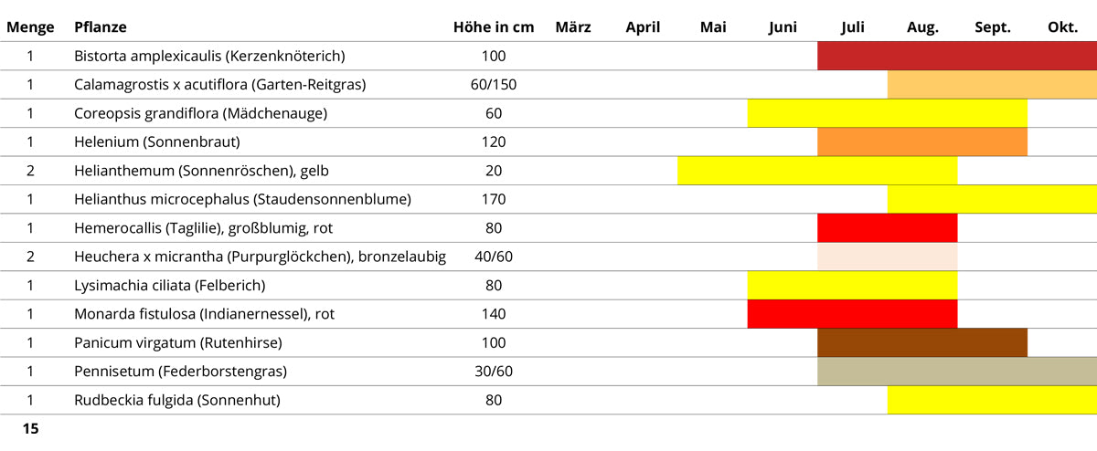 Wann blüht was und wie hoch werden die Pflanzen? in unserem Blütezeitkalender sehen Sie alle Bestandteile des Beet-Sets.
