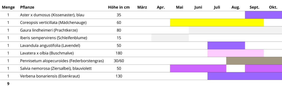 Wann blüht was und wie hoch werden die Pflanzen? in unserem Blütezeitkalender sehen Sie alle Bestandteile des Beet-Sets.