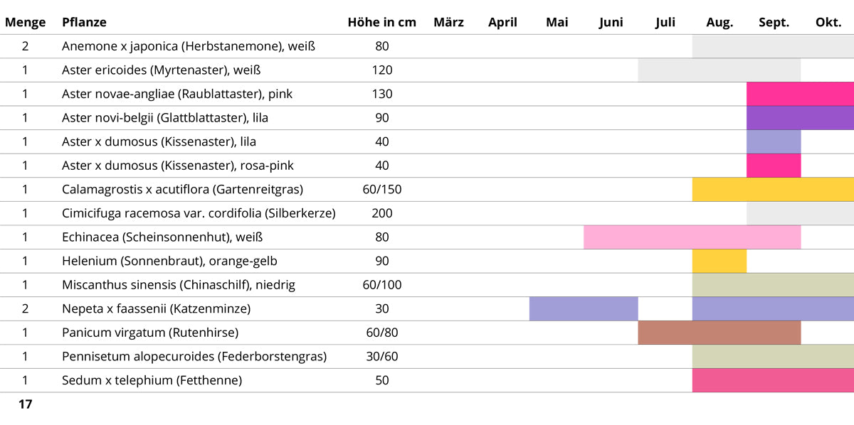 Ab Mai beginnt zarte, lilablaue Katzenminze zu blühen, die ab Juli von weißem Sonnenhut ergänzt wird. Ab August folgen die Fetthenne, die bereits im Sommer mit architektonischem Laub besticht, eine fröhliche Sonnenbraut in Goldorange und elegante, weiße Herbstanemonen. In keinem Herbstbeet dürfen jedoch Astern fehlen. Mit tausenden kleiner Blüten erfreuen im Beethintergrund eine hohe pinkrosafarbene Raublattaster, eine kräftig lilablaue Glattblattaster sowie eine weiße Myrtenaster bis Ende Oktober. Zwei niedrige Kissenastern in Blau und Magenta sorgen derweil im Beetvordergrund für Farbe. Aus diesem Blütenreigen erhebt sich ab September die Silberkerze mit schlanken, weißlich-zartrosa Blütenkerzen auf hohen Stängeln. Wie kleine Feuerwerke leuchten sie dabei über dem Beetensemble und sind zusammen mit den weißen Blüten des Sonnenhuts, den Herbstanemonen und der Myrtenaster auch in der Dämmerung noch lange zu sehen. Ein weiterer Bonus dieser Blütenstauden, sie werden als späte Nektarquellen liebend gern von Bienen, Hummeln und Schmetterlingen angeflogen und sorgen für reges Summen und Brummen im Beet.