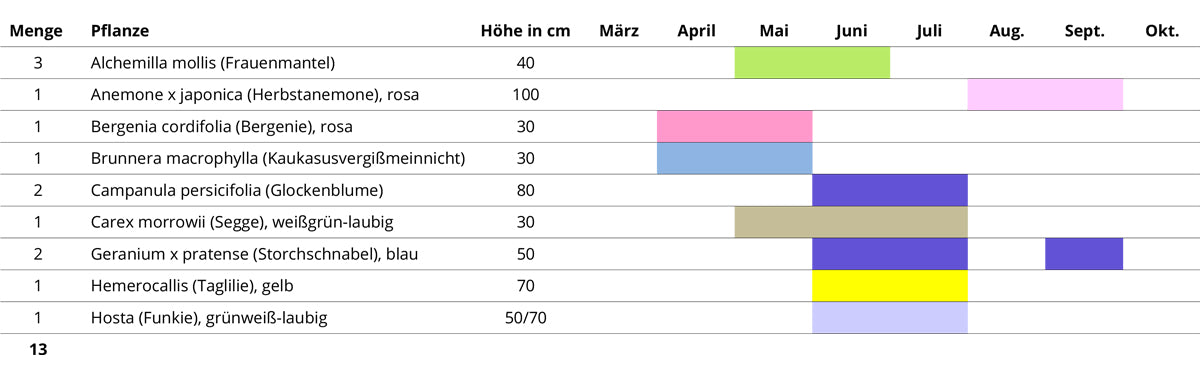 Gerade halbschattige Bereiche gibt es im Garten oft mehr, als man vermutet. Und deshalb haben wir dieses Staudenbeet gestaltet, das beispielsweise vor einer Hauswand in West- oder Ostlage prächtig zur Geltung kommt. Besonders wichtig waren uns drei Dinge – erstens gezielte optische Akzente: Hierfür sorgen bis zu einem Meter hohe Blütenstauden wie die Herbstanemone oder die Waldglockenblume, aber auch attraktive Blattschmuckstauden wie die weissbunte Funkie sowie die wintergrüne Bergenie. Zweitens: Leuchtende, strahlende Farben. Im Halbschattenbeet finden sich deshalb neben der gelb blühenden Taglilie auch das wunderbar blaue Kaukasusvergissmeinnicht sowie ein violettblauer Storchschnabel. Das Beet sollte drittens möglichst anhaltend blühen– und wirken. Bereits im Frühjahr zeigt die Bergenie ihre leuchtend rosafarbenen Blüten und bis in den Dezember hinein blüht dann die wüchsige Herbstanemone. Und selbst im Winter sorgt die immergrüne Japansegge für farbliche Tupfer.