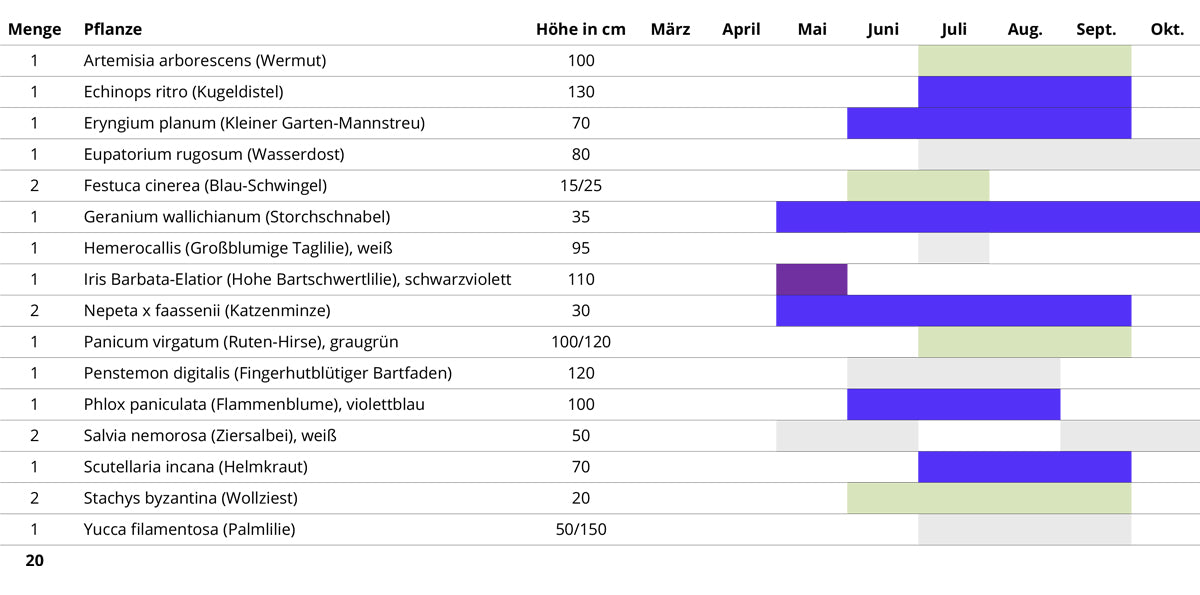 Wann blüht was und wie hoch werden die Pflanzen? in unserem Blütezeitkalender sehen Sie alle Bestandteile des Beet-Sets.