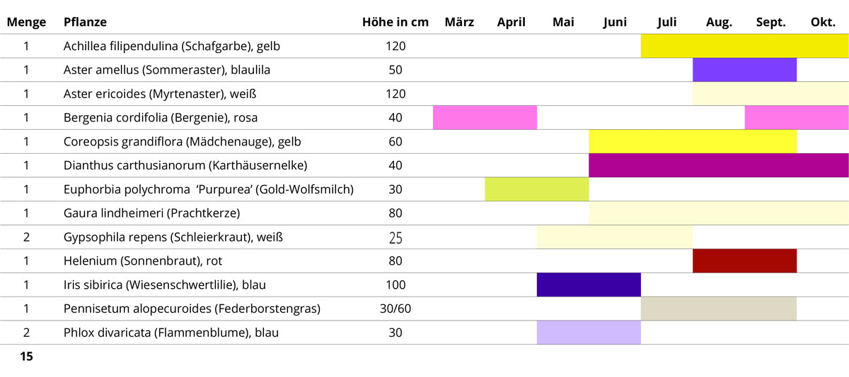 Es besteht aus sonnenliebenden, ausdauernden Pflanzen, die durch geschickte Auswahl für eine Blütezeit von März bis Oktober sorgen und dabei herrlich unkompliziert sind. Ideal also für alle noch hellgrünen Daumen, die sich erst langsam an ihren Garten herantasten möchten.