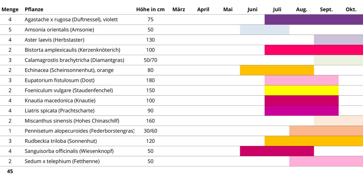 Wann blüht was und wie hoch werden die Pflanzen? in unserem Blütezeitkalender sehen Sie alle Bestandteile des Beet-Sets.