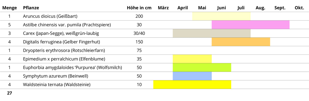 Meist ist es an diesen Standorten zudem so unwirtlich, dass auch Rasen nicht wachsen mag. Dieses Problem bestand auch im vorgestellten Beispielgarten. Zwar gab es dort bereits einen angenehm schattigen Sitzplatz, es fehlte jedoch noch an blütenreichem Begleitgrün im Bereich der Bäume.