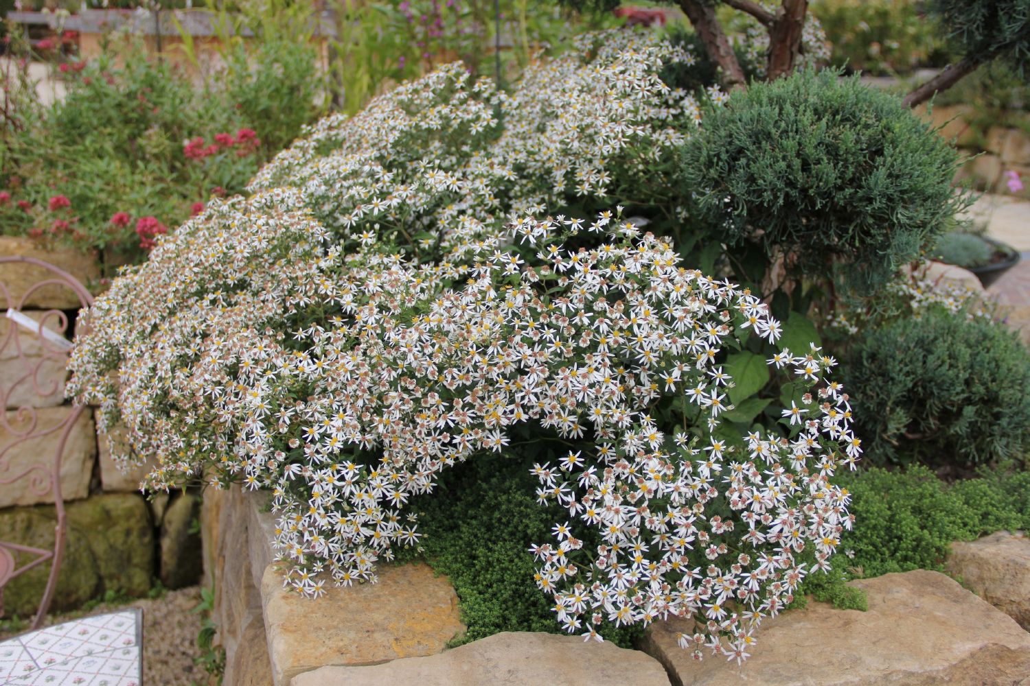 Lockere, breite Dolden weißer Blüten mit brauner Mitte, das ist das Kleid von Aster divaricatus. Die sogenannte Sperrige Aster ist gut geeignet für sandige Böden und trockenen Standort im Halbschatten.