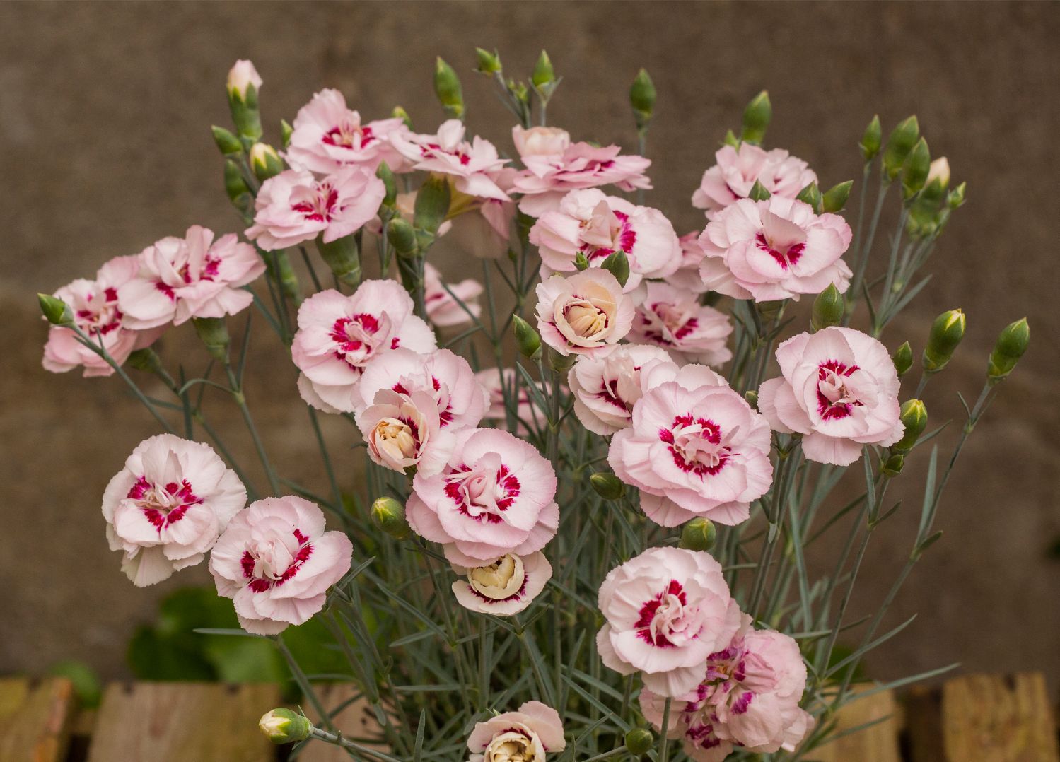 Geht es romantischer als Federnelken? Ihr altmodischer Charme liegt wieder ganz im Trend. Da passt Dianthus plumarius 'Angel of Virtue' mit ihren hübschen zweifarben Blüten in zartrosa mit rotem Auge perfekt dazu. Das kleine Blütenwunder reckt von Mai bis Juni auf zarten Stängeln seine duftenden Blüten empor und ist die ideale Pflanze für Balkonkästen und Mauerkronen, wo sie mit ihren immergrünen nadelartien Blattpolstern zusätzlich für Blattschmuck sorgt.