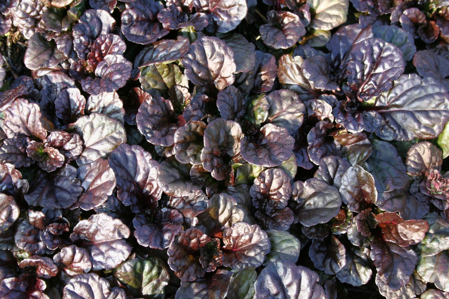 Die zur Zeit schönste Günsel-Sorte mit glänzendem schwarzem Laub und blauvioletten Blütenkerzen.