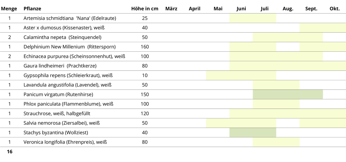 Wann blüht was und wie hoch werden die Pflanzen? in unserem Blütezeitkalender sehen Sie alle Bestandteile des Beet-Sets.