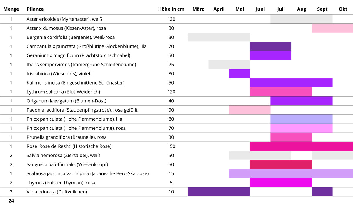 Den Auftakt des Gartenjahres übernehmen Duftveilchen sowie eine Bergenie mit rosa überhauchten Blüten. Kommt der April und Mai reichen sich eine immergrüne Schleifenblume, Sibirische Wieseniris, weißer Ziersalbei, eine alpine Witwenblume sowie eine imposante, rosa-gefüllt blühende Staudenpfingstrose den Staffelstab weiter. Nicht sattsehen kann man sich im Sommer, wenn eine wunderbar duftende historische Rose, Prachtstorchschnabel, eine großblütige Glockenblume, zarte Schönaster, Braunelle, Blutweiderich und duftende Flammenblumen ihr Blütenfeuerwerk entzünden. Filigraner Wiesenknopf bereichert zusätzlich mit weinroten Knöpfchen-Blüten das Bild. Im Herbst ziehen eine Myrtenaster sowie eine kleine Kissenaster noch einmal alle Register, um uns mit letzter Farbe zu beschenken.