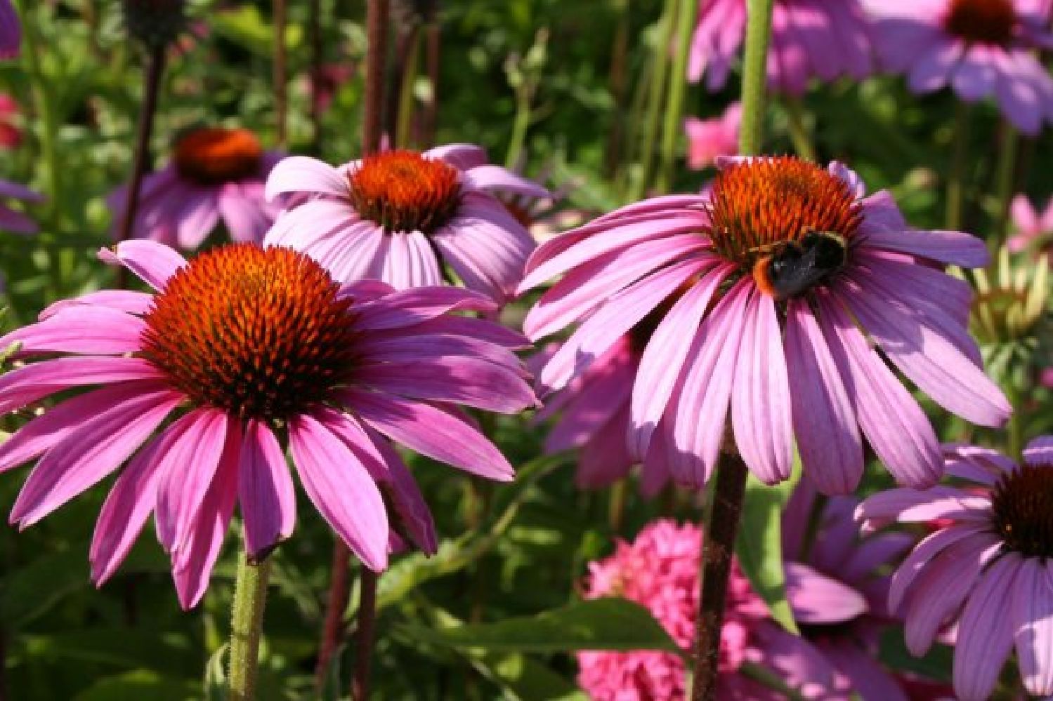 Für weitere Farbtupfer sorgen ergänzende Blütenstauden, die in die Pflanzung eingestreut sind. So leuchtet von Hochsommer bis Herbst rosafarbener Purpursonnenhut zwischen den Gräserhorsten. Zart schwebt hohes Eisenkraut über allem und ergänzt sich prächtig mit hohem Kandelaber-Ehrenpreis. Weiße Blütchen breitet die zartstängelige Prachtkerze ab Juni aus und blüht unermüdlich bis in den November. Für einen Hauch Extravaganz sorgt eine Edeldistel mit ihren silbergrauen Blütenkugeln, die sich auf langen Stängeln über den Gräsern erheben. Zwei aromatische Duftnesseln runden das Ensemble mit violetten Kerzenblüten ab. Und das Beste an dieser Pflanzenkomposition? Sie ist trotz Pflegeleichtigkeit auch insektenfreundlich, denn alle Blütenstauden bieten sowohl Bienen als auch Hummeln und Faltern viel Nektar.