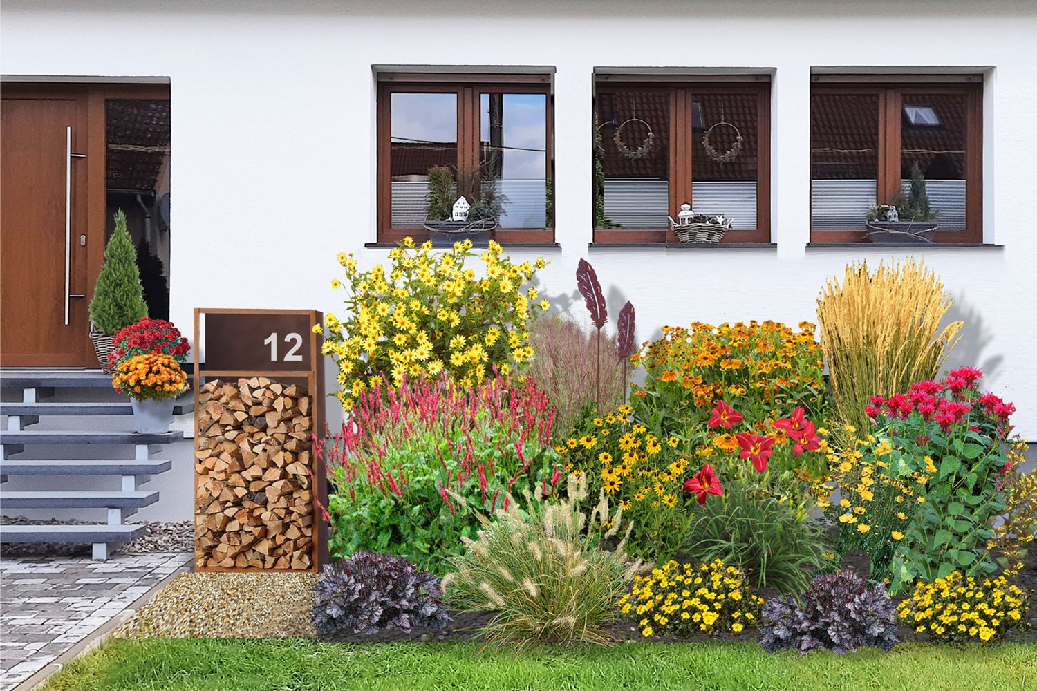 Damit Sie schon im Frühling mit bunten Blüten begrüßt werden, empfehlen wir zusätzlich Blumenzwiebeln zu pflanzen, z.B. farbenfrohe Tulpenmischungen, die von Sonnenröschen abgelöst werden. Im Sommer beginnt die Hauptblüte von „Indian-Summer“ mit leuchtenden Sonnenuntergangsfarben, die bis weit in den Herbst hinein reicht. Von „Indian Summer“ kann man auch herrliche Sträuße schneiden!