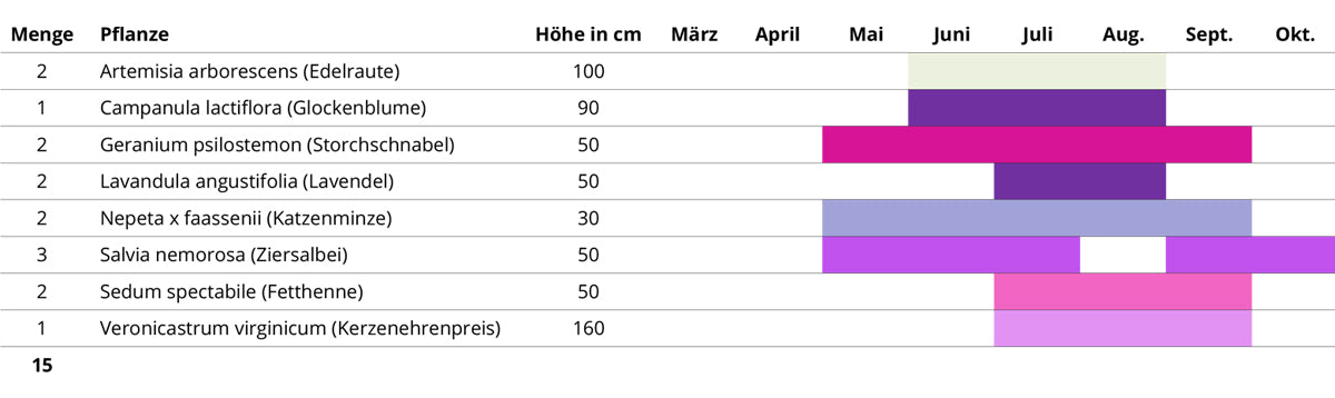Wann blüht was und wie hoch werden die Pflanzen? in unserem Blütezeitkalender sehen Sie alle Bestandteile des Beet-Sets.