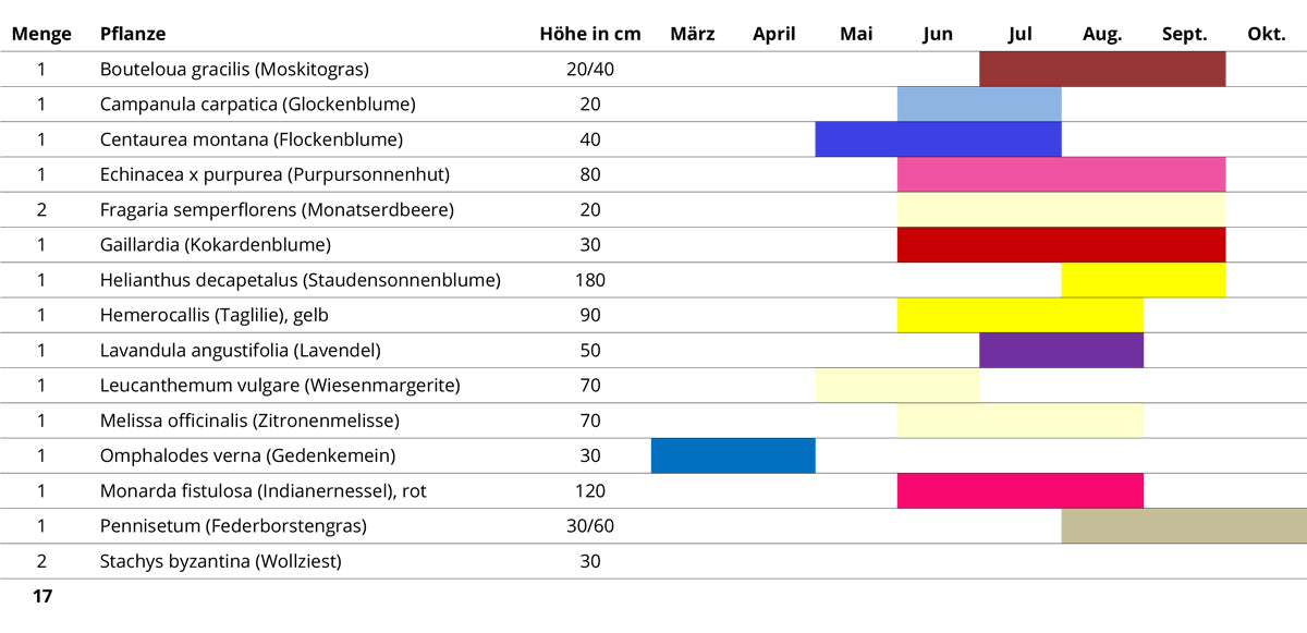 Wann blüht was und wie hoch werden die Pflanzen? in unserem Blütezeitkalender sehen Sie alle Bestandteile des Beet-Sets.