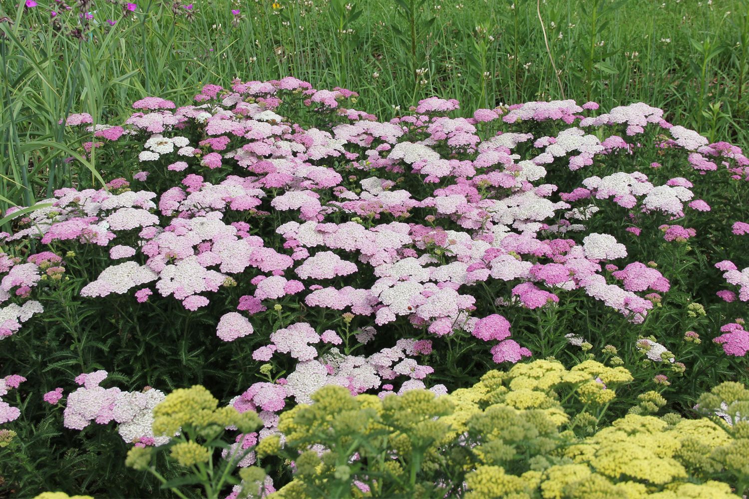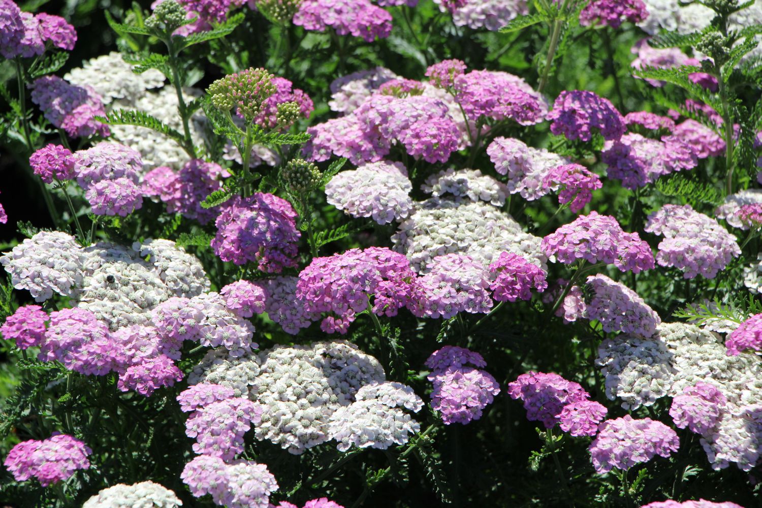 Ein Traum in Weiß-Rosa ist die Schafgarbe Achillea 'Appleblossom' wenn sie im Hochsommer ihre schirmförmigen Blütendolden öffnet. Diese changieren in der Farbe von kräftig Rosa bis fast Reinweiß und lassen sich wunderbar für Beete in zarten Farben einsetzen.