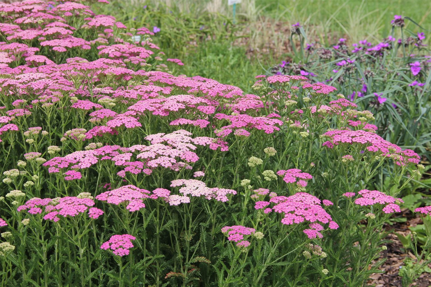 Horstartig wachsend, bildet Achillea millefolium 'Pretty Belinda'® mit ihrem dunkelgrünen, fein gefiederten Laub einen schönen Kontrast zu den graugrünen Blattschwertern der Bartiris und anderen großlaubigen Sonnenstauden wie Bergenien. Werden die abgeblühten Triebe regelmäßig herausgeschnitten, streckt sich die im Juni beginnende Blütezeit bis Ende August.