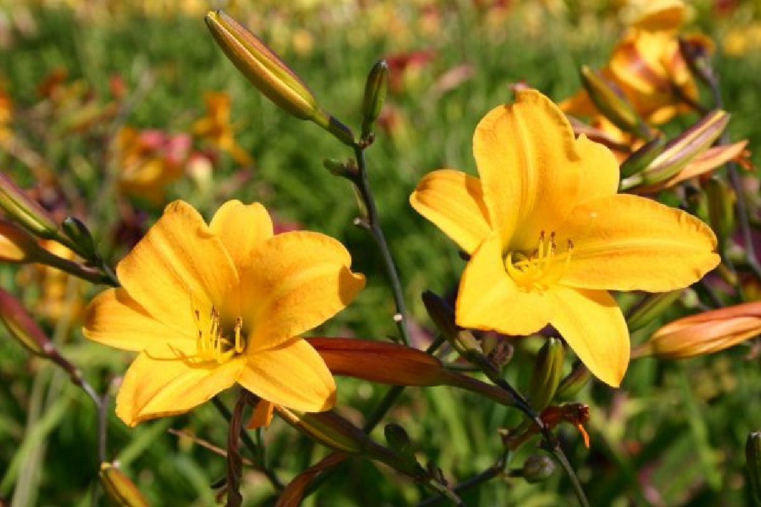 Das Beetensemble „Happy“ versprüht pures Glück, wenn es über die Sommermonate seine ganze Farbenpracht entfaltet. Hier wird klares Gelb einer miniaturblütigen Taglilie, Nachtkerze, Mädchenauge und Sonnenröschen geschickt kontrastiert durch sattes Rot einer Schafgarbe sowie niedriger Mazedonischer Witwenblume. Den fröhlichen Farbdreiklang vervollständigen Katzenminze, Ehrenpreis und Teppich-Glockenblume mit kräftig-lilablauen Blüten, so dass das Beetensemble einem schon von weitem entgegenleuchtet.