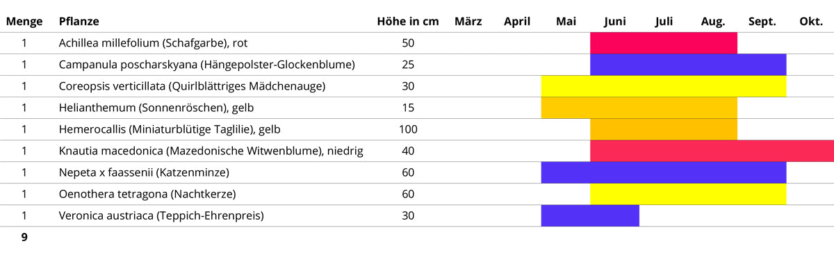 Wann blüht was und wie hoch werden die Pflanzen? in unserem Blütezeitkalender sehen Sie alle Bestandteile des Beet-Sets.