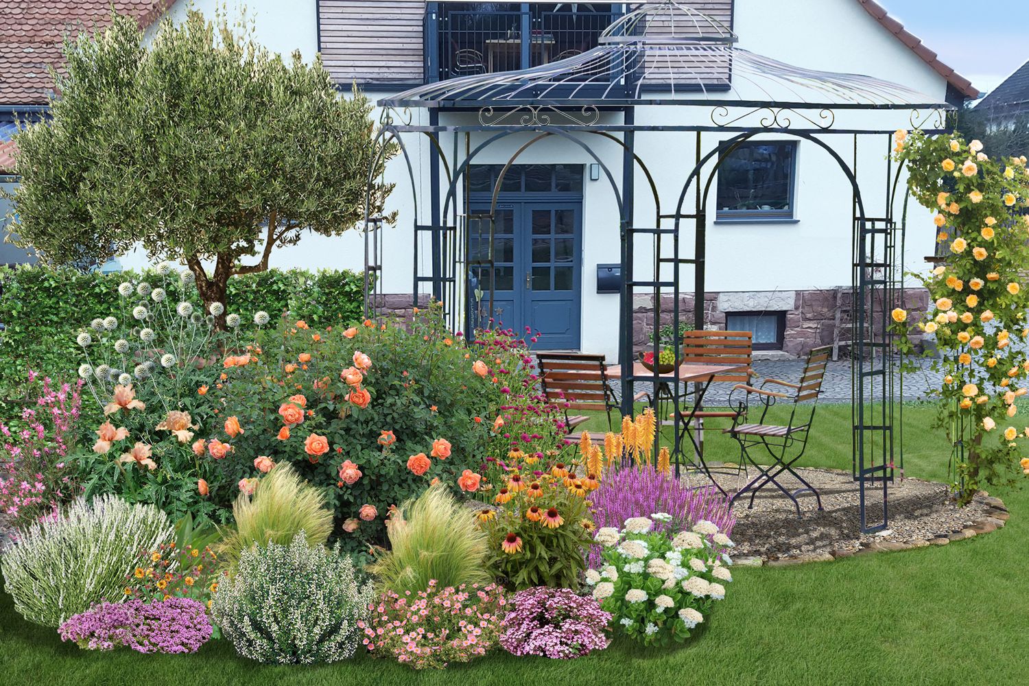 Mit warmen Farben und feinem Duft, so bezaubert die Beetidee 'Alhambra', wenn sich von April bis Oktober in steter Abfolge die Blüten öffnen. Star und Mittelpunkt des Beetes ist die Königin der Blumen, eine Englische Strauchrose in warmen Apricot-Tönen, die umkränzt wird von ihrem Hofstaat aus Prachtstauden, Kräutern und Gräsern.