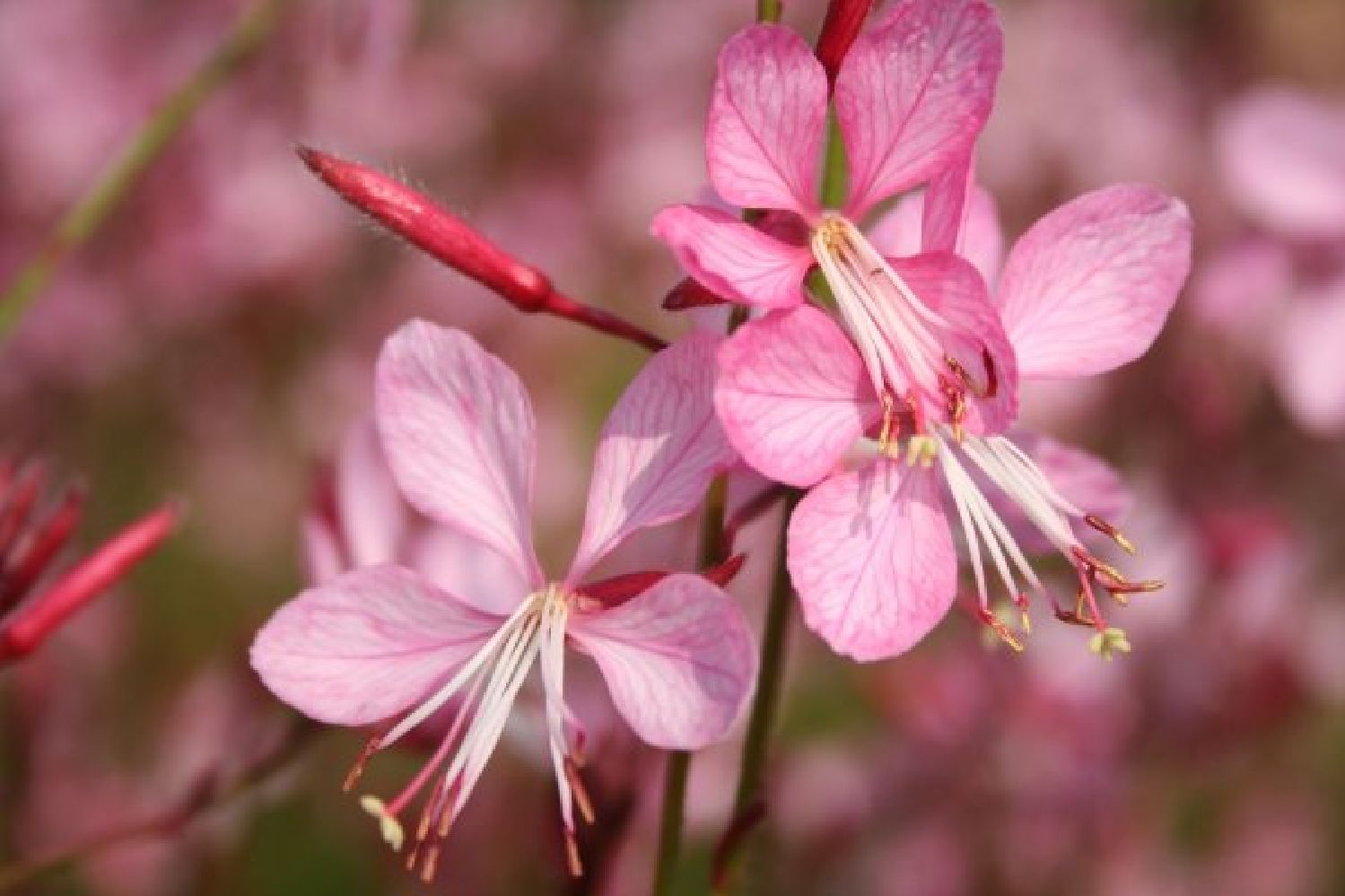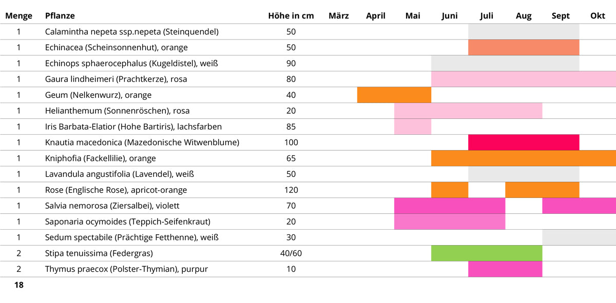 Das Gartenjahr startet zunächst mit den entzückenden Blüten einer Nelkenwurz. Im Wonnemonat Mai schließen sich eine duftende hohe Bartiris, violettes Teppichseifenkraut sowie lange blühender Ziersalbei an. Ein rosa Sonnenröschen bildet dazu ein blütenreiches Kissen an der Beetkante, das bis in den August hinein für Farbe sorgt. Kommt der Juni beginnt die Englische Rose zu blühen, zu der sich im Beethintergrund eine elegante weiße Kugeldistel gesellt, die für tolle Akzente sorgt. Die filigrane Mazedonische Witwenblume schmiegt sich dann ebenso gefällig in das Ensemble wie eine dauerblühende Prachtkerze. Weißer Lavendel, würziger Steinquendel und Teppichthymian verwöhnen die Nase, während Fackellilie und changierender Scheinsonnenhut über Wochen für exotisches Flair sorgen und ganz nebenbei als fulminante Bienen-, Hummel- und Schmetterlingsweide dienen. Den Abschluss des Blütenreigens bildet eine weiße Fetthenne, die im Spätsommer noch einmal zum Nektarhotspot avanciert. Abgerundet wird das Beet durch zwei Federgräser, die sich sanft im Sommerwind wiegen und für den ultimativen mediterranen Touch sorgen. Wer will da noch auf Reisen gehen?