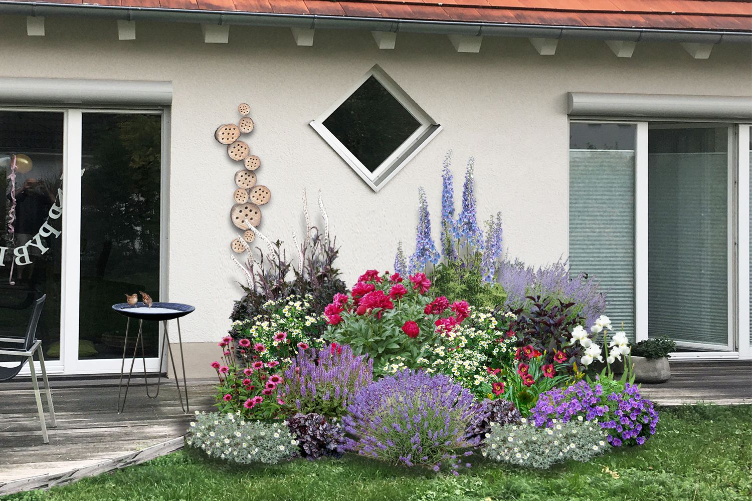 Wenn der Frühling da ist und einen mit den ersten warmen Sonnenstrahlen und einer wärmenden Tasse Kaffee ins Freie lockt, ist oft die Sehnsucht groß, seinen Sitzplatz im Garten mit frischer Farbe und Blüten zu beleben, hier ist das 'Beet in Feierlaune' perfekt geeignet. So auch in diesem Beispiel eines Einfamilienhauses mit zwei Terrassendecks, die nur durch eine Rasenfläche miteinander verbunden waren. Ein idealer Ort, um ein neues Beet anzulegen und so beiden Sitzflächen zu einer blütenreichen Begrenzung zu verhelfen.
