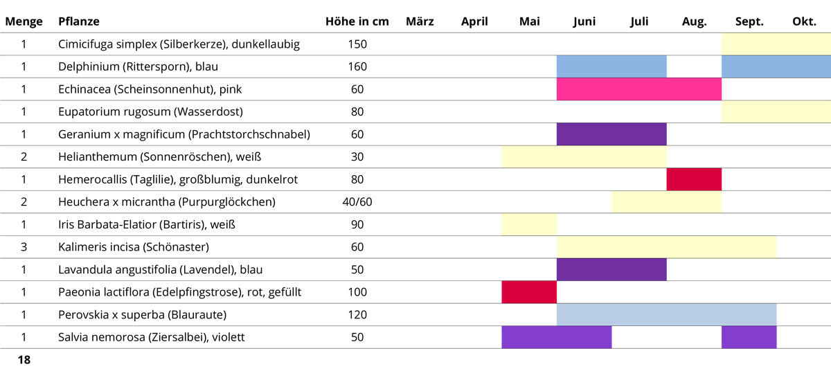 Wann blüht was und wie hoch werden die Pflanzen? in unserem Blütezeitkalender sehen Sie alle Bestandteile des Beet-Sets.