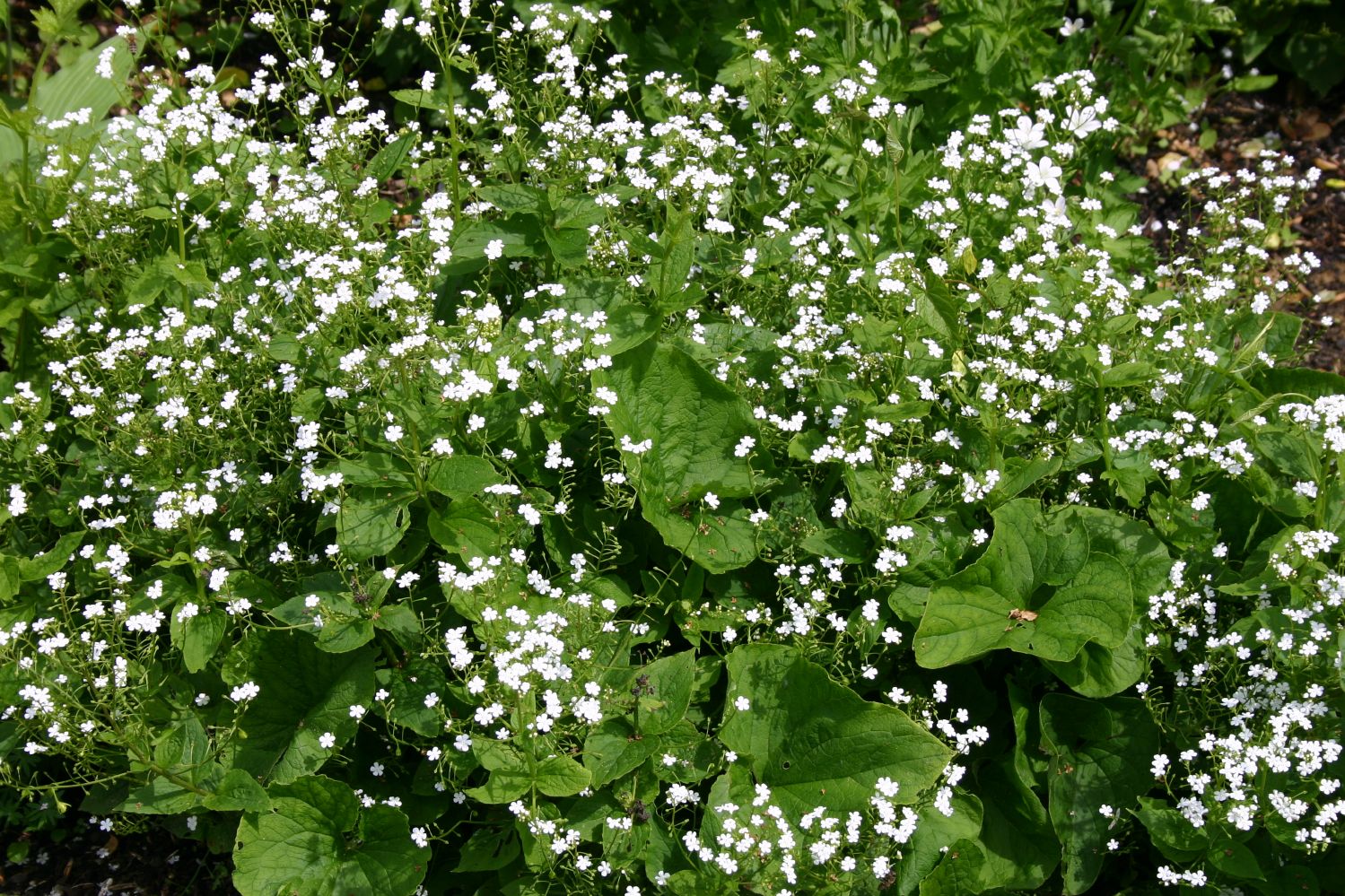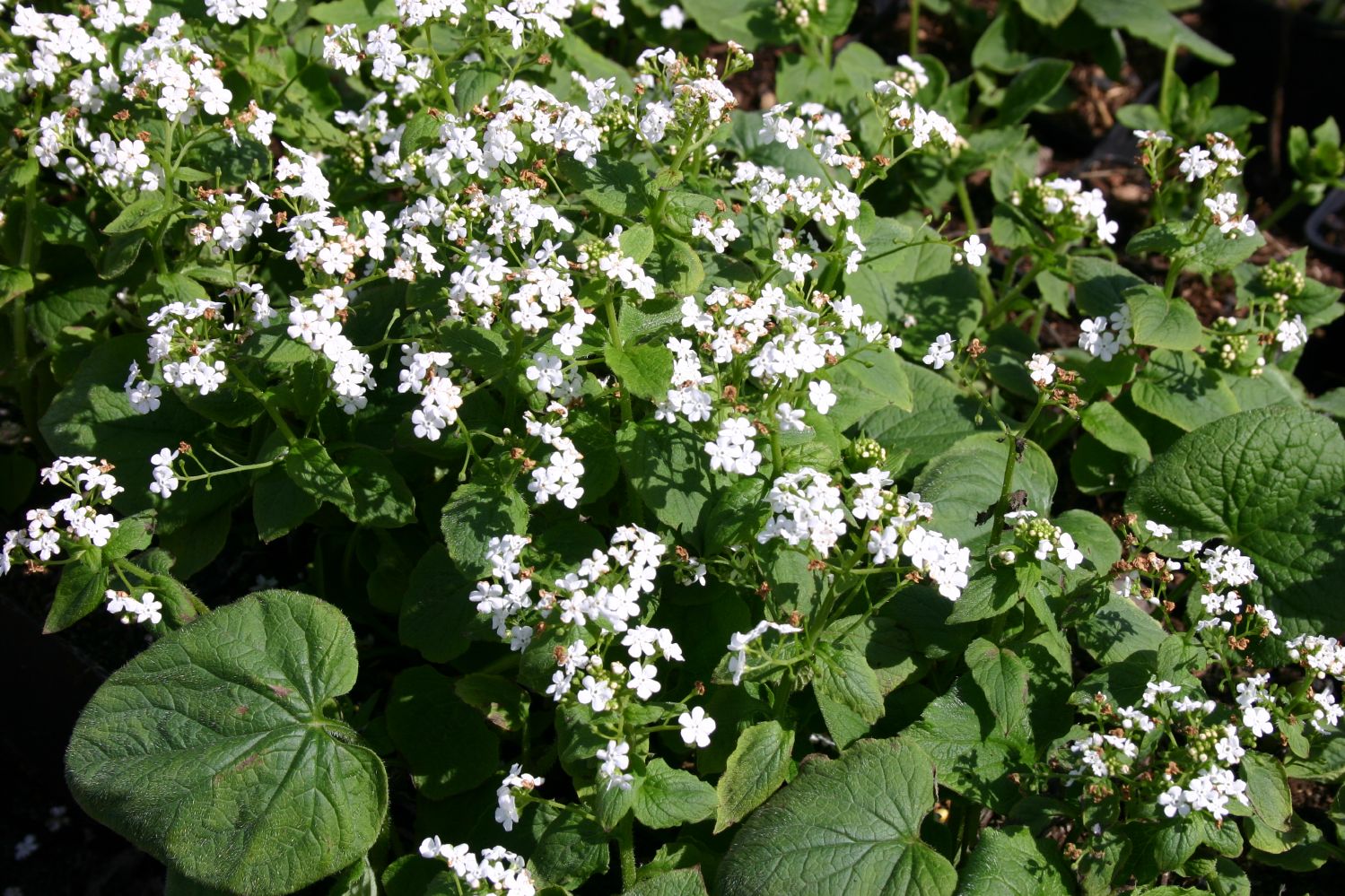 Brunnera macrophylla 'Betty Bowring' ist eine sehr reichblütige Variante des Kaukasusvergissmeinnicht, die im Gegensatz zur Wildart mit schneeweißen Blüten aufwartet. Diese sorgen gerade in schattigen Gartenbereichen für optische Aufhellung, denn hier kommen weiße Blüten vor allen anderen Farben ganz besonders schön zur Geltung. Das neutrale Weiß der Blüten über satt grünem Laub ist zudem perfekt für elegante Pflanzungen, da es immer edel wirkt.
