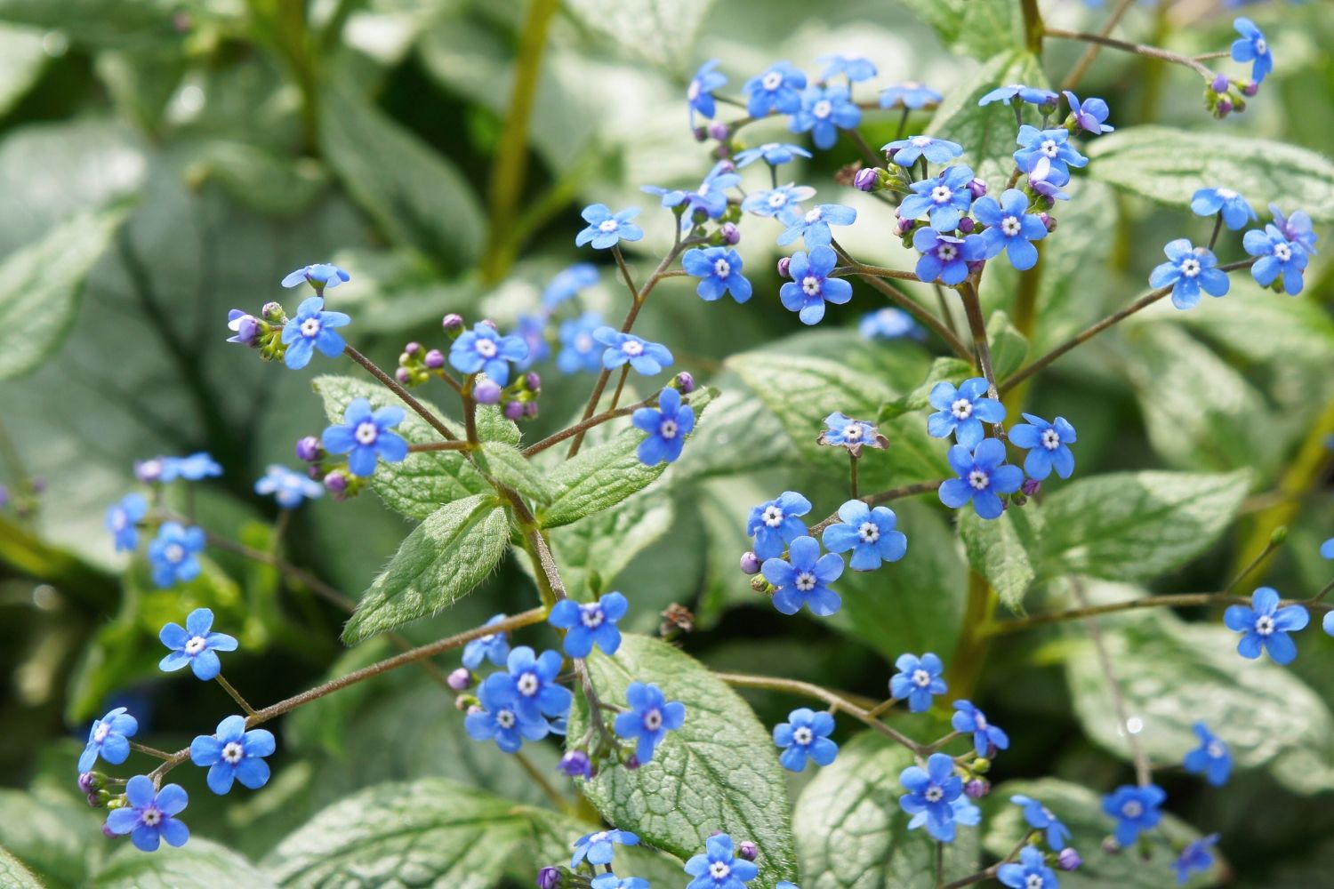 Nicht zu verachten sind auch die filigranen Wolken himmelblauer Vergissmeinnicht-Blütchen, die sich ab April über den üppigen Blatthorsten erheben. So schmückt die Pflanze nicht nur mit ihrem Laub den Frühlingsgarten. Hübsch kombinieren kann man die attraktive Blattschmuckstaude im Beet mit Funkien, Tränendem Herz, Lenzrosen und Purpurglöckchen. Auch als Solität im Kübel macht Brunnera macrophylla 'Jack of Diamonds' ® eine gute Figur.