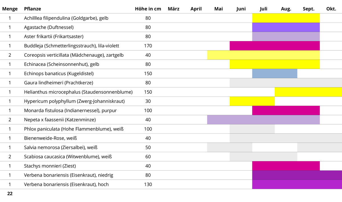 Wann blüht was und wie hoch werden die Pflanzen? in unserem Blütezeitkalender sehen Sie alle Bestandteile des Beet-Sets.