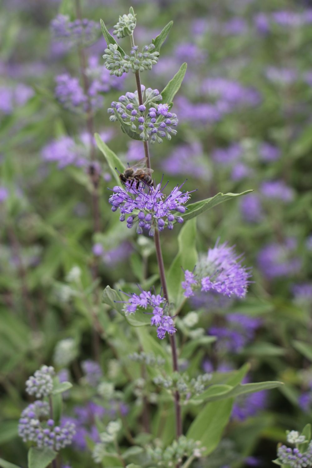Caryopteris x clandonensis 'Dark Knight' ist eine der schönsten Sorten im Sortiment der Bartblumen. Ihre nach Honig duftenden Blüten sind tiefblau gefärbt und ziehen von Hoch- bis Spätsommer magisch Bienen, Hummeln und Schmetterlinge an. Ihr Wuchs ist dabei so kompakt, dass sie auch für kleine Gärten perfekt geeignet ist und im Beet einen schönen Begleiter zu Rosen und Stauden abgibt.