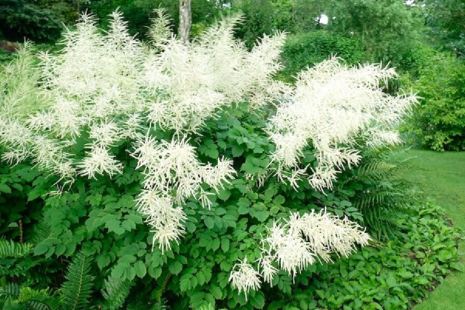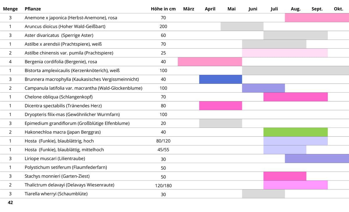 Die Blütenstauden beginnen ihren Reigen ab März mit der leuchtenden Blüte der rosa Bergenien gefolgt von Kaukasus-Vergissmeinnicht und Tränendem Herz. Im Laufe der Sommermonate erblühen Waldglockenblumen, Prachtspieren, Ziest, Schlangenkopf und Astern. Duftig-zart steigen im Juli die lila Blütenwolken der Wiesenraute aus dem Beet auf und bilden einen traumhaft schönen Schleier. Ab August bis Oktober beschließen Herbst-Anemonen das Gartenjahr und erfreuen über Wochen mit ihren kräftig rosa Blüten. Natürlich dürfen auch Höhe und Struktur in diesem Beet nicht fehlen. So sorgen der weiße Kerzenknöterich und der stattliche Wald-Geißbart im Hintergrund für nötiges Volumen.