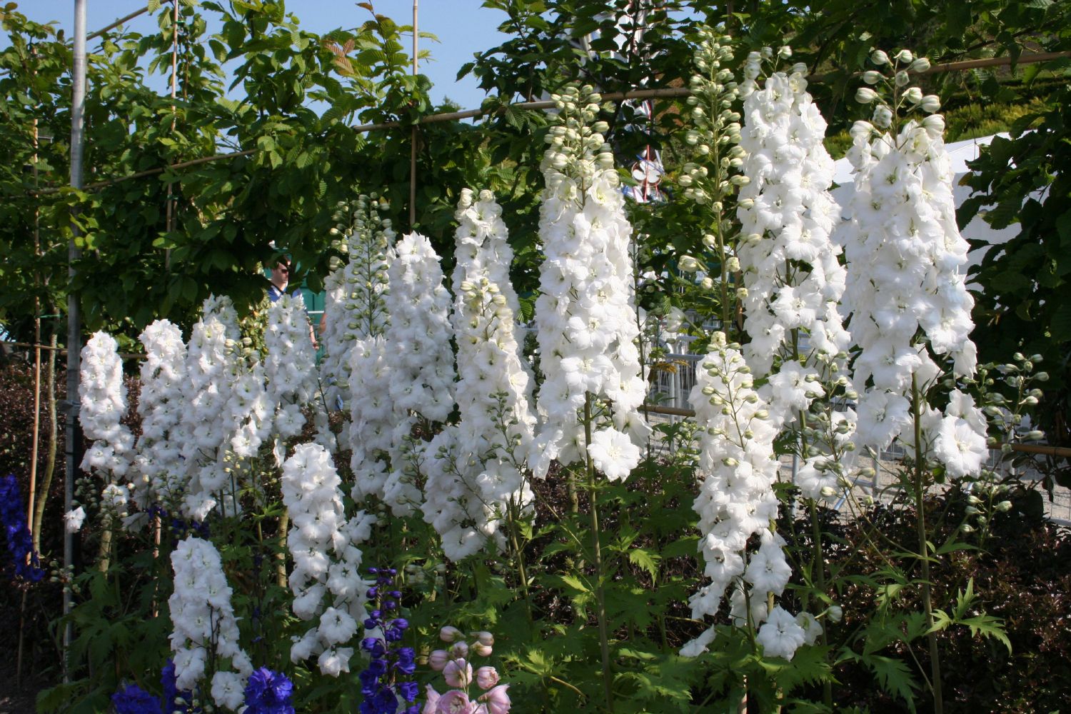Um in den vollen Genuss dieses frühsommerlichen Blütenspektakels zu kommen, muss Delphinium New Millenium 'Double Innocence' wie alle Rittersporne einen bevorzugten Platz im sonnigen Beet auf gut gepflegtem Gartenboden erhalten. Der frische Austrieb ist mit Argusaugen zu hüten und vor Schneckenfraß zu bewahren. Um Wachstum und Blüte zu fördern, wird zweimal in der Saison gedüngt. Erstmals im Frühling und dann ein weiteres Mal nach dem Rückschnitt im Juni, der sich unmittelbar an die erste Blühphase anschließt, um die remontierbereiten Stauden zu einer Nachblüte im Frühherbst anzuregen. Um den kräftigen, standfesten Blütentrieben Hilfe beim Stemmen der gewaltigen Blütenmasse zu geben, ist schon zeitig an ein entsprechendes Abstützen der Horste im Frühjahr zu denken.