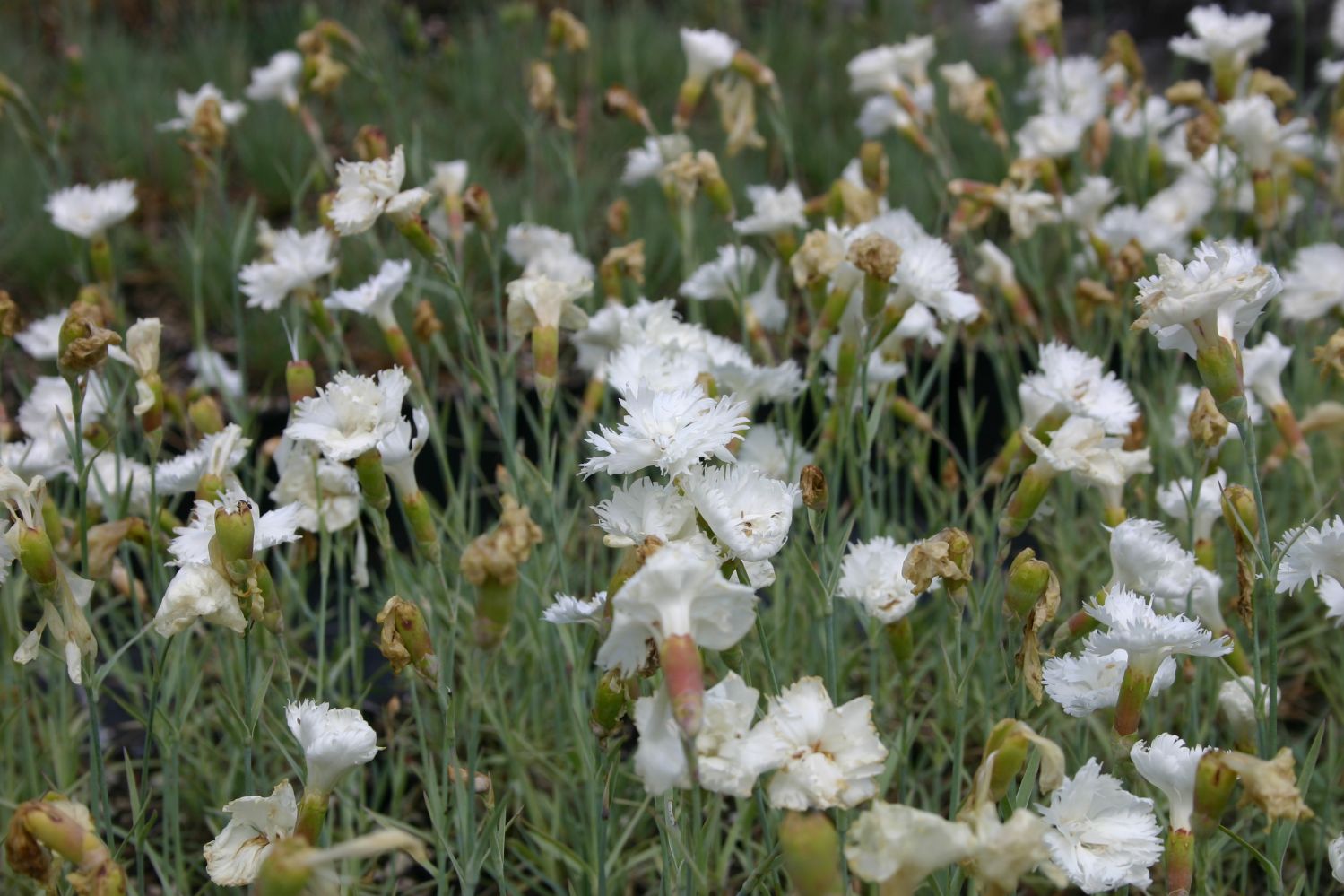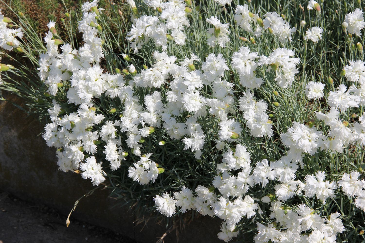 Eine verführerisch duftende Federnelke mit weißgefüllten Blüten, die im Steingarten, als Randbepflanzung von Terrassen und Wegen, im Beetvordergrund, als Grabschmuck oder als romantisches Kleinod im Blumenkasten entzückt.