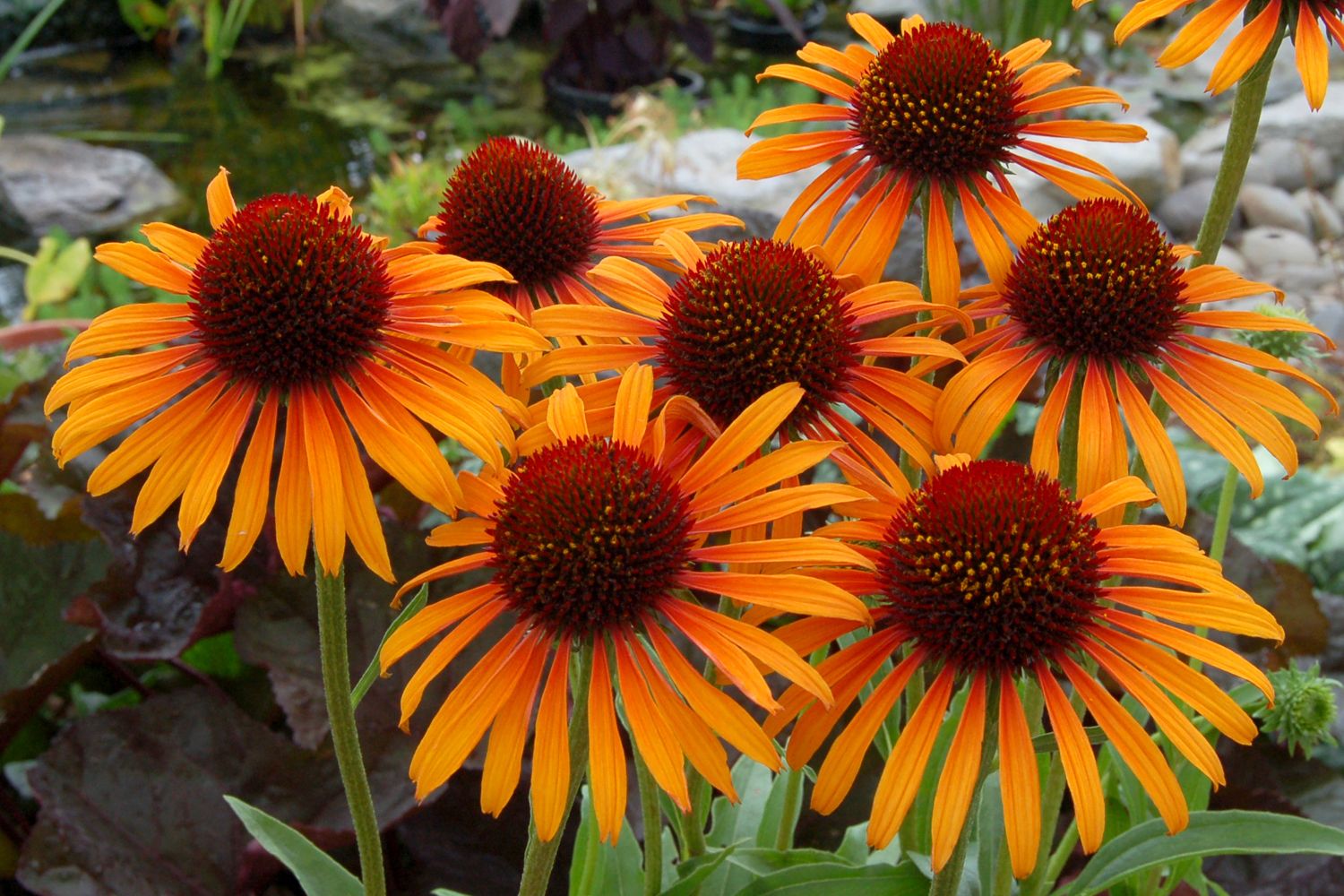 Flammen ins Beet bringen, ja das kann Echinacea 'Flame Thrower' problemlos, wenn sie ab Juli ihre zahlreichen leuchtend orangefarbenen Blüten öffnet, die zur dunklen Blütenmitte hin ziegelrot überhaucht sind. Begeisterungswürdig ist auch die Höhe dieses stattlichen Scheinsonnenhuts, der mit 90 cm zu einer der ganz Großen im Sortiment zählt.