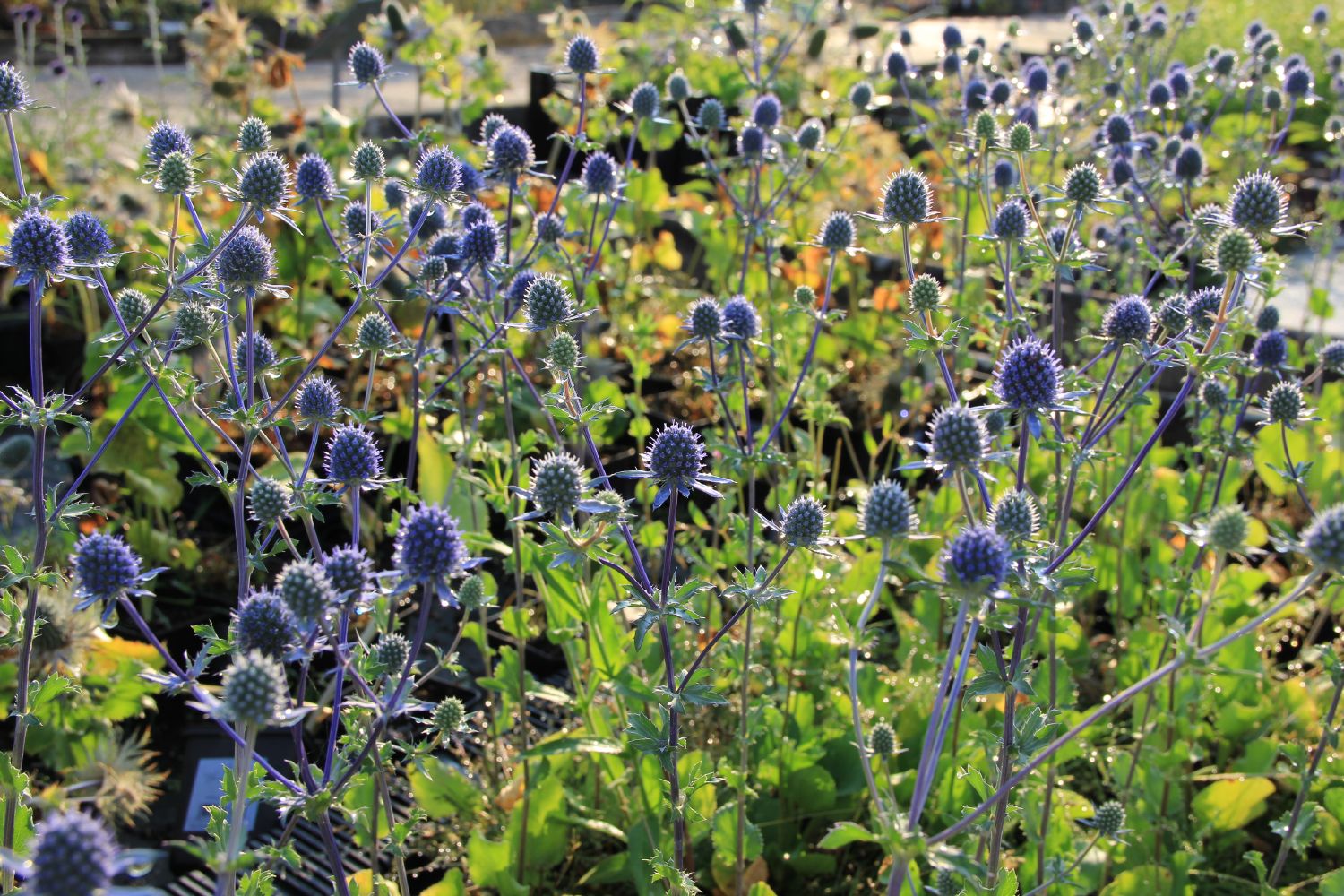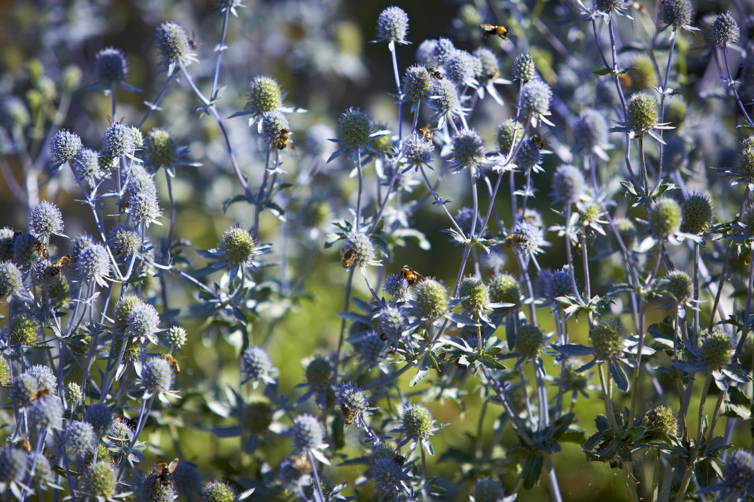 Eryngium planum ist eine robuste distelähnliche Staude für sonnige und trockene Standorte. Tiefblaue kugelige Köpfchen mit geschlitzten, dornigen Hüllblättern bilden reich verzweigte Blütenstände, die über viele Wochen (Juni bis August) ein echter Blickfang sind! Dabei ist die Edeldistel äußerst beliebt bei Bienen und Schmetterlingen. Sie wird ca. 50 cm hoch und eignet sich auch sehr gut für die Balkon- und Kübelpflanzung. Eryngium planum „Blauer Zwerg“ ist außerdem eine begehrte Schnittstaude, die sich auch zum Trocknen eignet. Herrlich in Kombination z.B. mit Gräsern, Scabiosen oder farblich stark kontrastierenden Euphorbien!