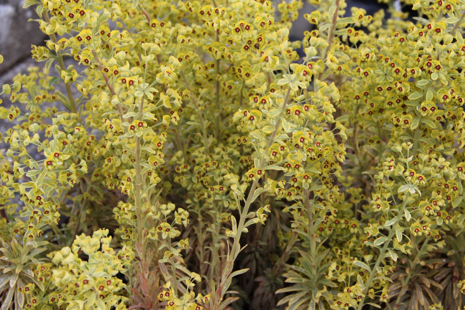 Im Frühjahr empfiehlt es sich, einzelne alte Stängel bodeneben herauszuschneiden, um neuen, farbenfrohen Jungwuchs zu fördern. Bei dieser Pflegemaßnahme sollten möglichst Handschuhe getragen werden, um Kontakt mit dem Haut irritierenden Milchsaft der Wolfsmilch zu vermeiden.