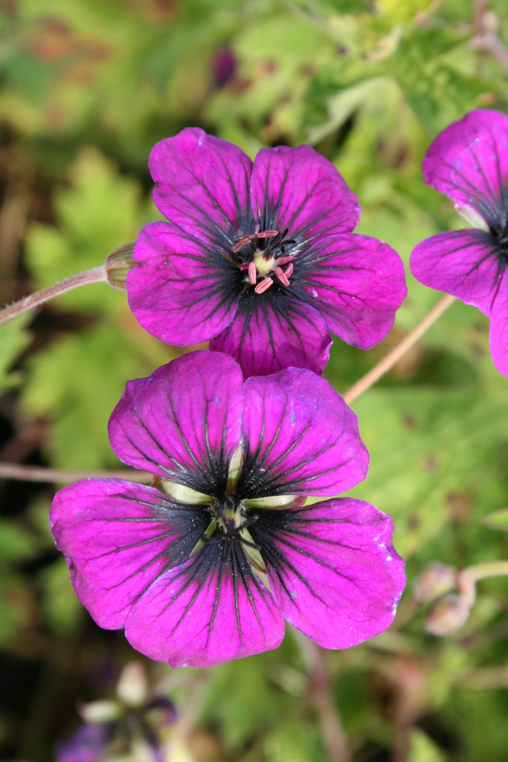 Blüht sehr lange in leuchtendem Magenta mit einem dunkleren Auge und gelbgrünem Laub und entwickelt einen bis zu 1,5 m breiten Busch.