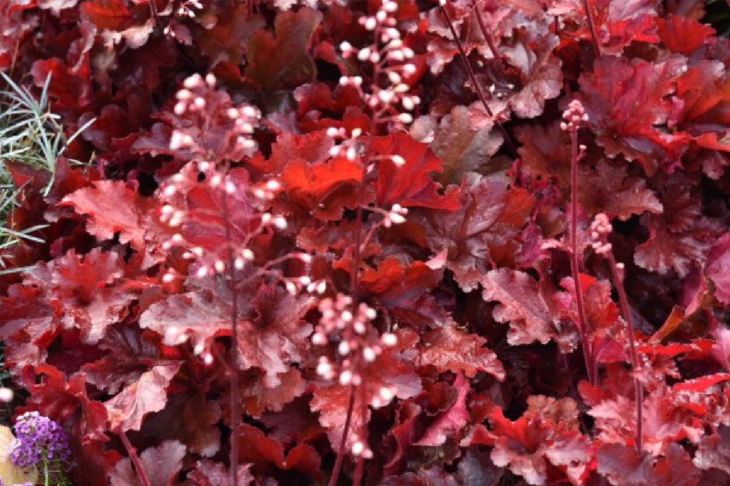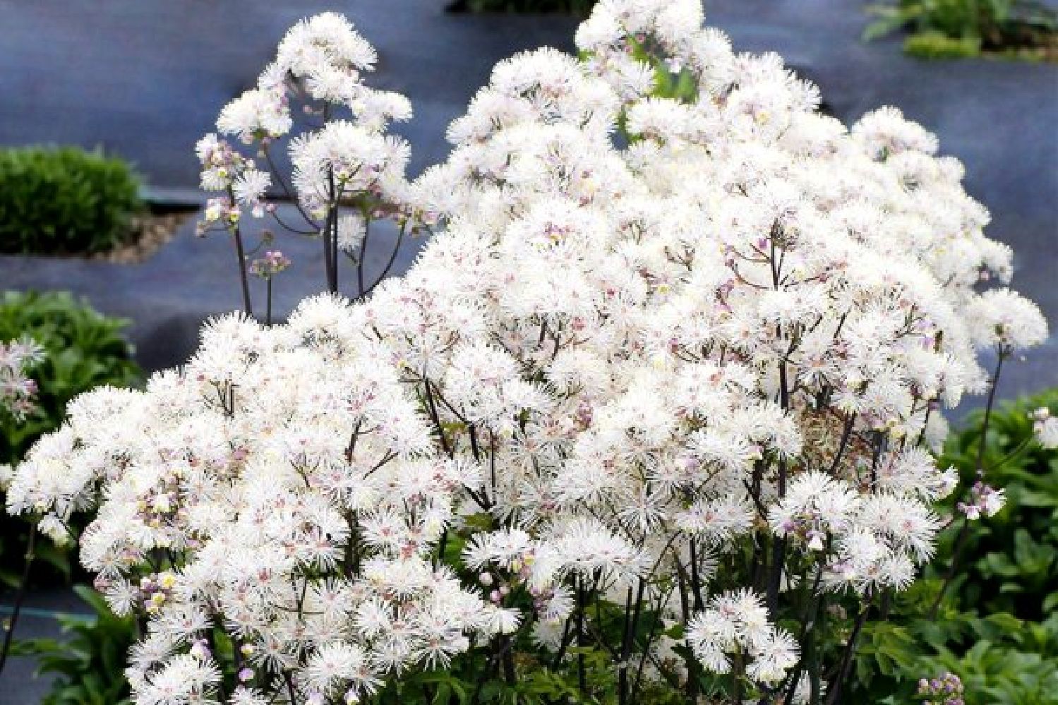 Für ultimative japanische Eleganz sorgen im Hintergrund eine weiße Wiesenraute mit pomponartigen Blüten auf hohen Stielen sowie eine schneeweiße Herbst-Anemone, die feierlich das Gartenjahr beschließt. Haben sich alle Pflanzen zur Winterruhe zurückgezogen, leuchtet noch immer das Laub der Purpurglöckchen von Weitem und weckt gleich einer still-lächelnden Geisha die Vorfreude auf das nächste Gartenjahr!