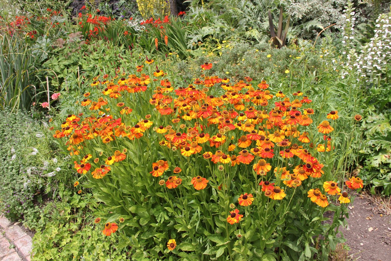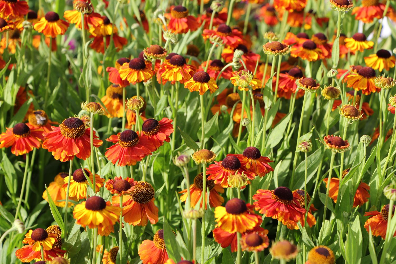 Eine der besten Sonnenbraut-Auslesen! Helenium 'Sahin's Early Flowerer' blüht früh und ausdauernd über die Sommermonate in fröhlichem Gelb-Orange-Rot und besitzt dabei eine ungeheure Strahlkraft.