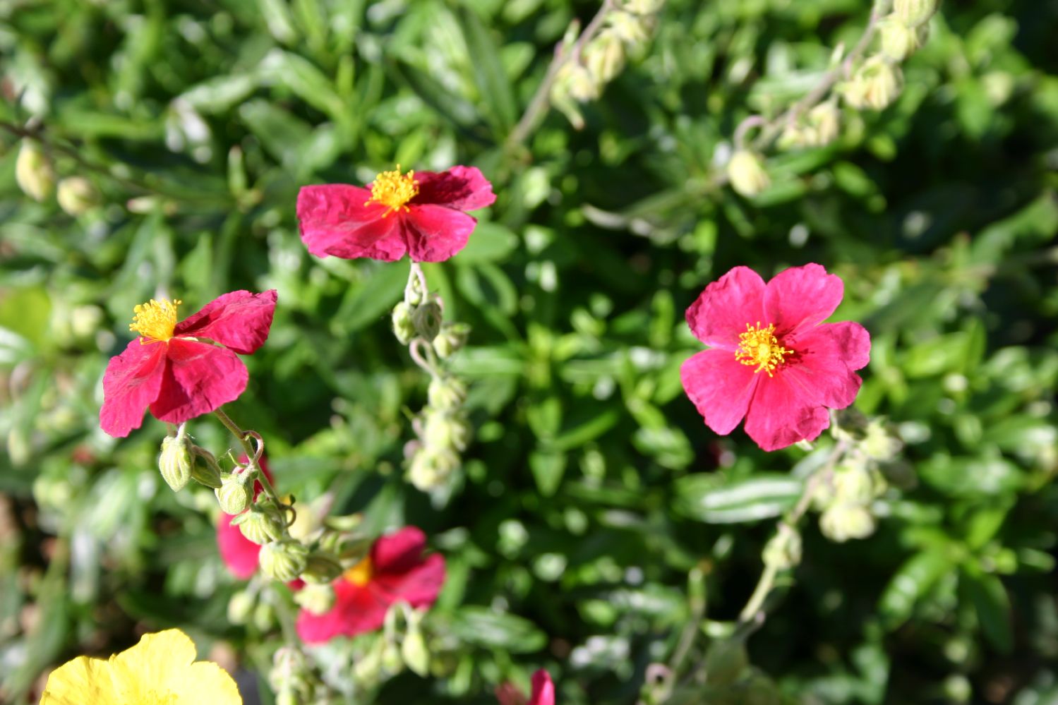 Wie Lavendel und Heiligenkraut, gehört auch das mit den Zistrosen verwandte Sonnenröschen zu den wintergrünen Halbsträuchern. Sein schmalblättriges, silber-grünes Laub bildet kompakte Polster, die zum Formerhalt und zur Verjüngung der Pflanzen gleich nach der Blütezeit mit einem Rückschnitt versehen werden.