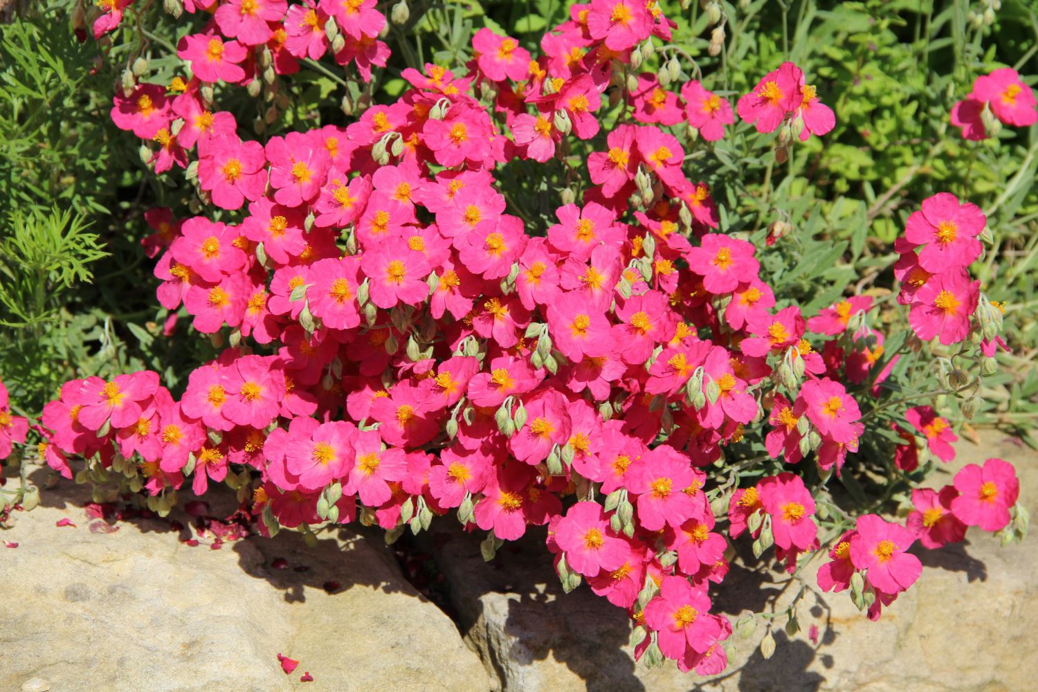 Helianthemum 'Rosa Königin' sind wiintergrüne Zwergsträucher mit kleinen, schalenförmigen Blüten. Mit ihrem besonderen grauen Laub und einfachen rosa Blüten finden diese Sonnenröschen Verwendung in sonnigen Lagen wie Steingärten und trockenen Böschungen, als Einfassung oder Vorpflanzung. TIPP: Ein Rückschnitt nach der Blüte fördert einen dichten, buschigen Wuchs.