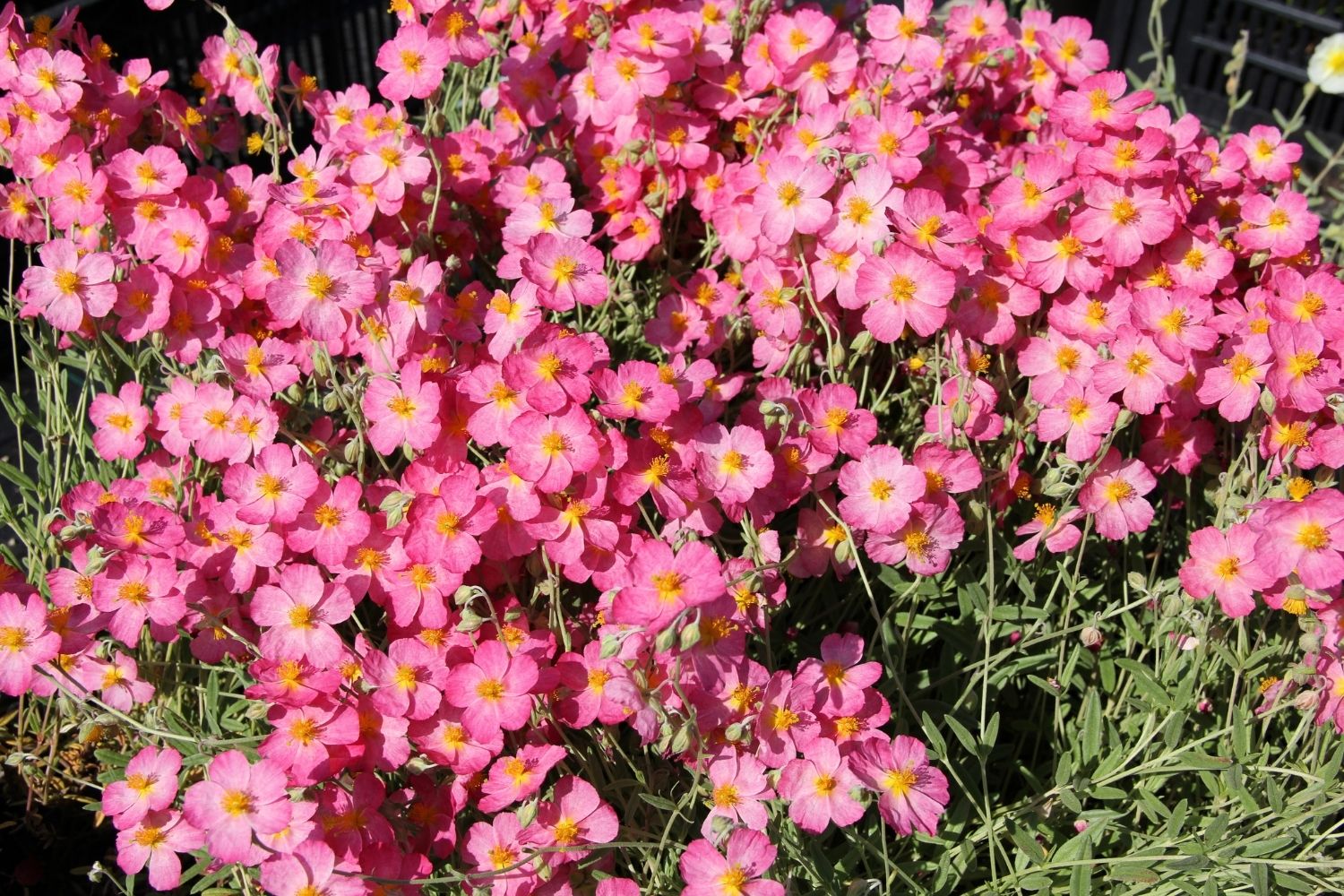 Das Sonnenröschen 'Whisley Pink' ist eine bezaubernde Blütenstaude, die mit ihrem reichen Flor an rosafarbenen Blüten für sommerliche Leichtigkeit im Garten sorgt. Von Mai bis Juli schmückt sich Helianthemum 'Whisley Pink' mit unzähligen, schalenförmigen Blüten, die sich bei Sonnenschein öffnen und gerne von Bienen besucht werden. Der niedrige, polsterartige Wuchs mit immergrünem, graugrünem Laub macht diese Sorte zu einer attraktiven und gleichzeitig pflegeleichten Bereicherung für sonnige Pflanzungen.
