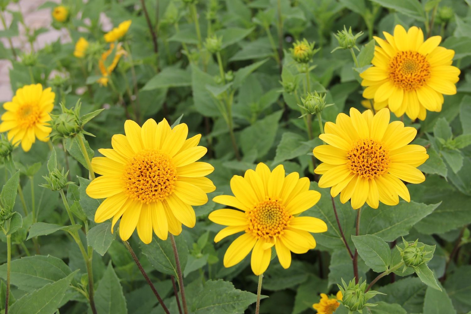 Helianthus decapetalus 'Capenoch Star' ist eine Staudensonnenblume mit großen, einfachen Blüten, leuchtend gelb und reichblühend. Der Blütendurchmesser beträgt ca.15 cm. Diese mehrjährigen Ausgaben der einjährigen Sonnenblumen sind wundervoll Leuchtende standfeste Dauerblüher in sonnigen Gartenbereichen. Begehrte Schnittblumen.