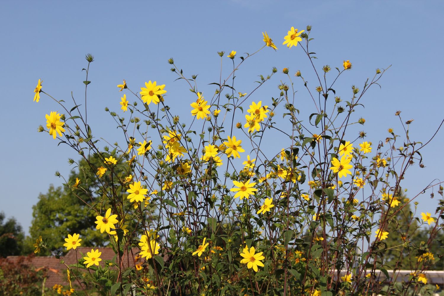 Das Lächeln des Sommers, eingefangen und widergespiegelt in einer fröhlichen Schar einfacher, limonengelber Strahlenblüten, die diese Staudensonnenblume ab August freigiebig in großer Zahl produziert.