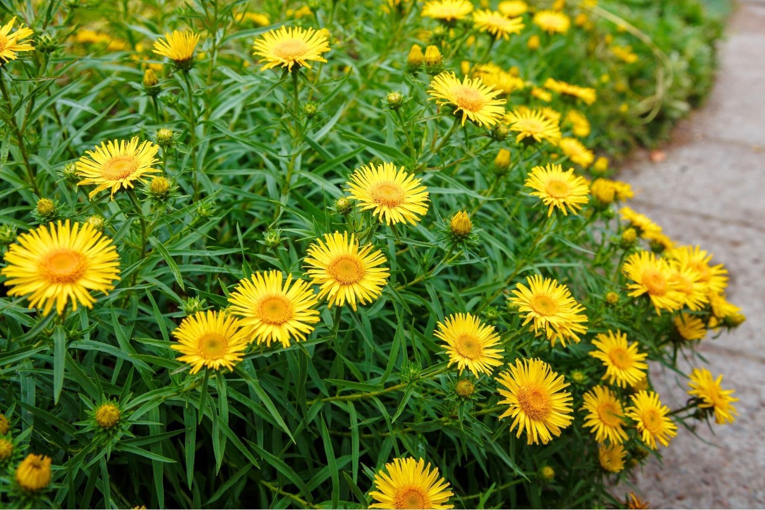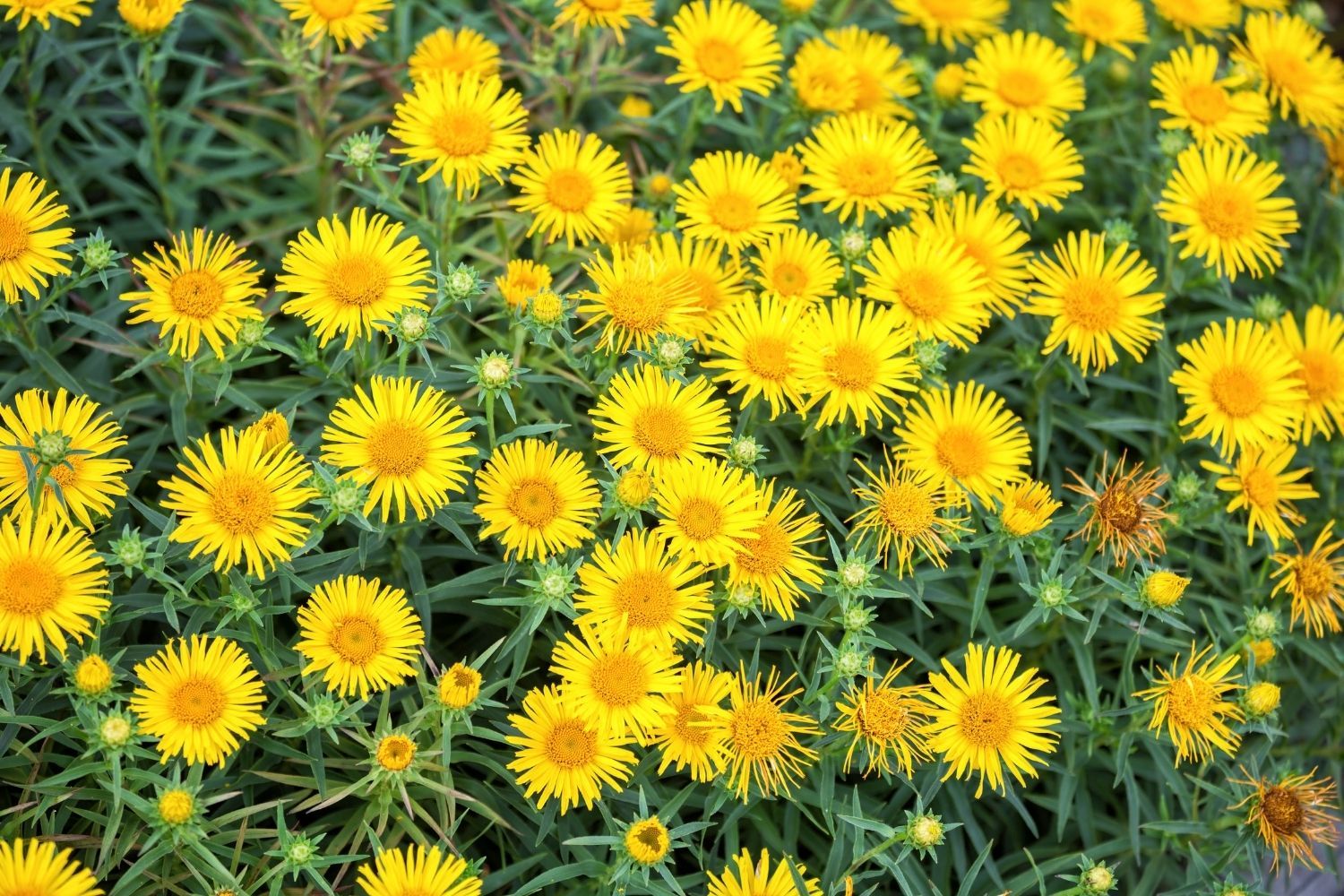 Sommerblühende Staude mit gelben Korbblüten, dankbar und anspruchslos, viel Trockenheit vertragend. Zwergalant, dessen Kugelbüsche wochenlang mit gelben Blüten übersät sind. Einer der wenigen Steingartenblüher für den Sommer.