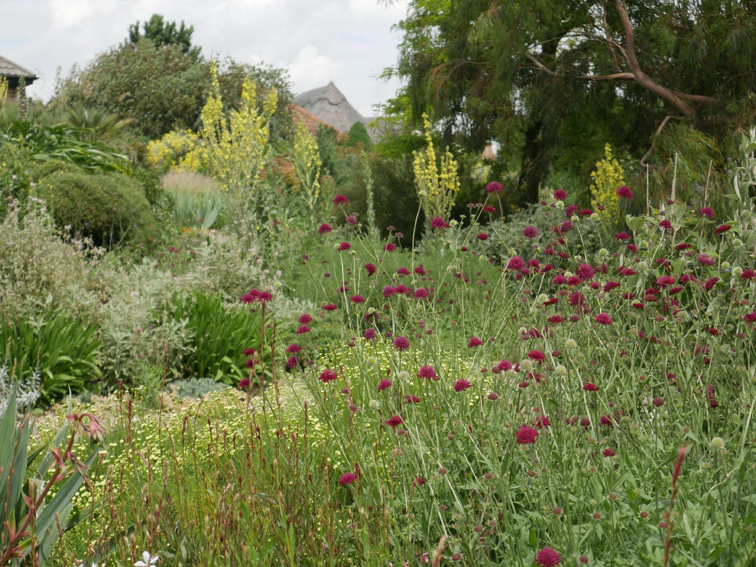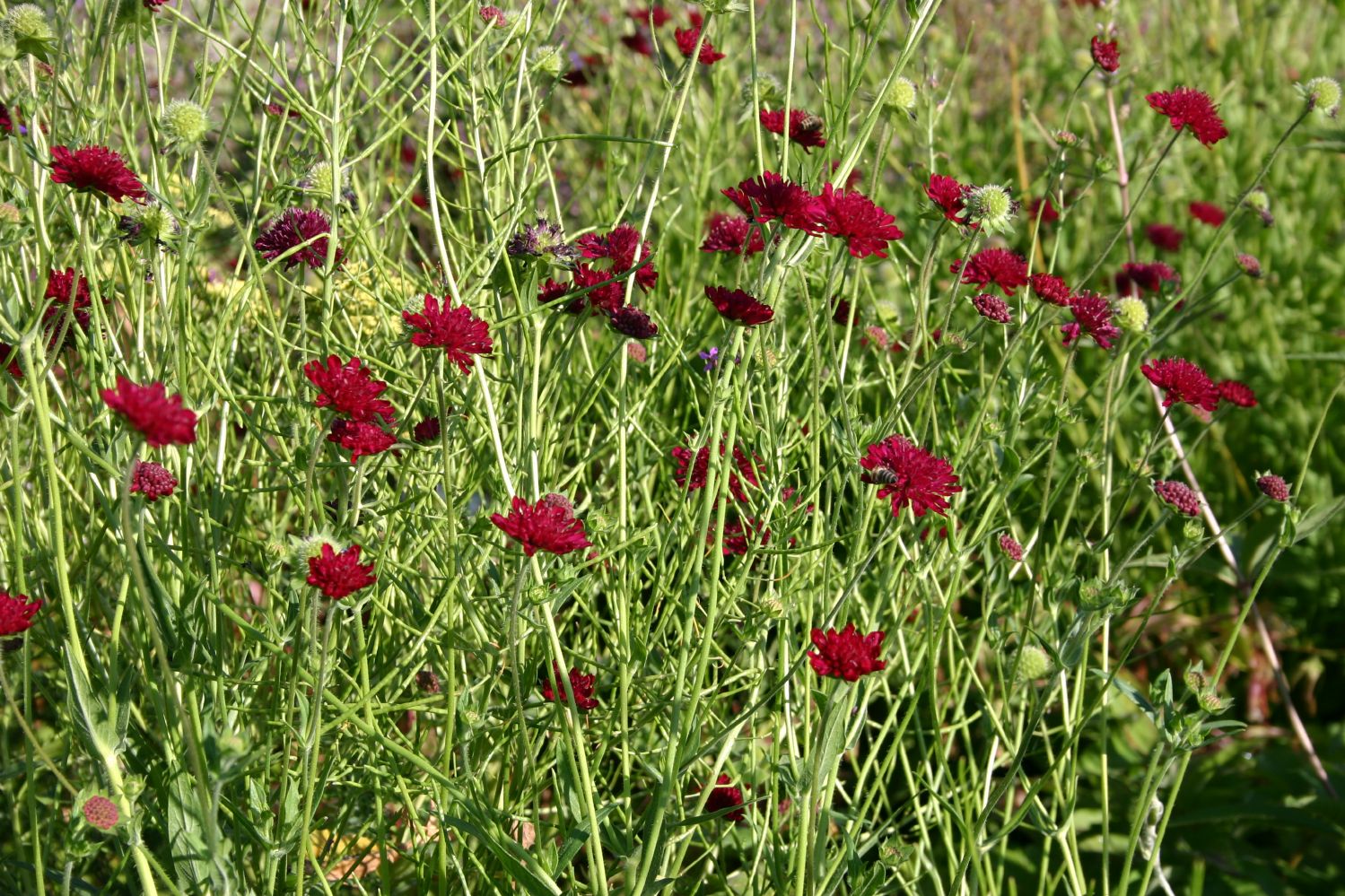 Auf hohen, drahtigen Stielen schickt Knautia macedonica ihre weinroten Blütenschirme ins Rennen um die anmutigste Erscheinung im hochsommerlichen Garten. Mit Erfolgsaussichten denn ab Juli lässt diese lang und reich blühenden Wildstaude aus der Balkanregion ihre dunkelroten, stecknadelkissen-ähnlichen Blüten erhaben und leicht über Storchschnäbel, Ziersalbei und Co. hinwegsegeln.