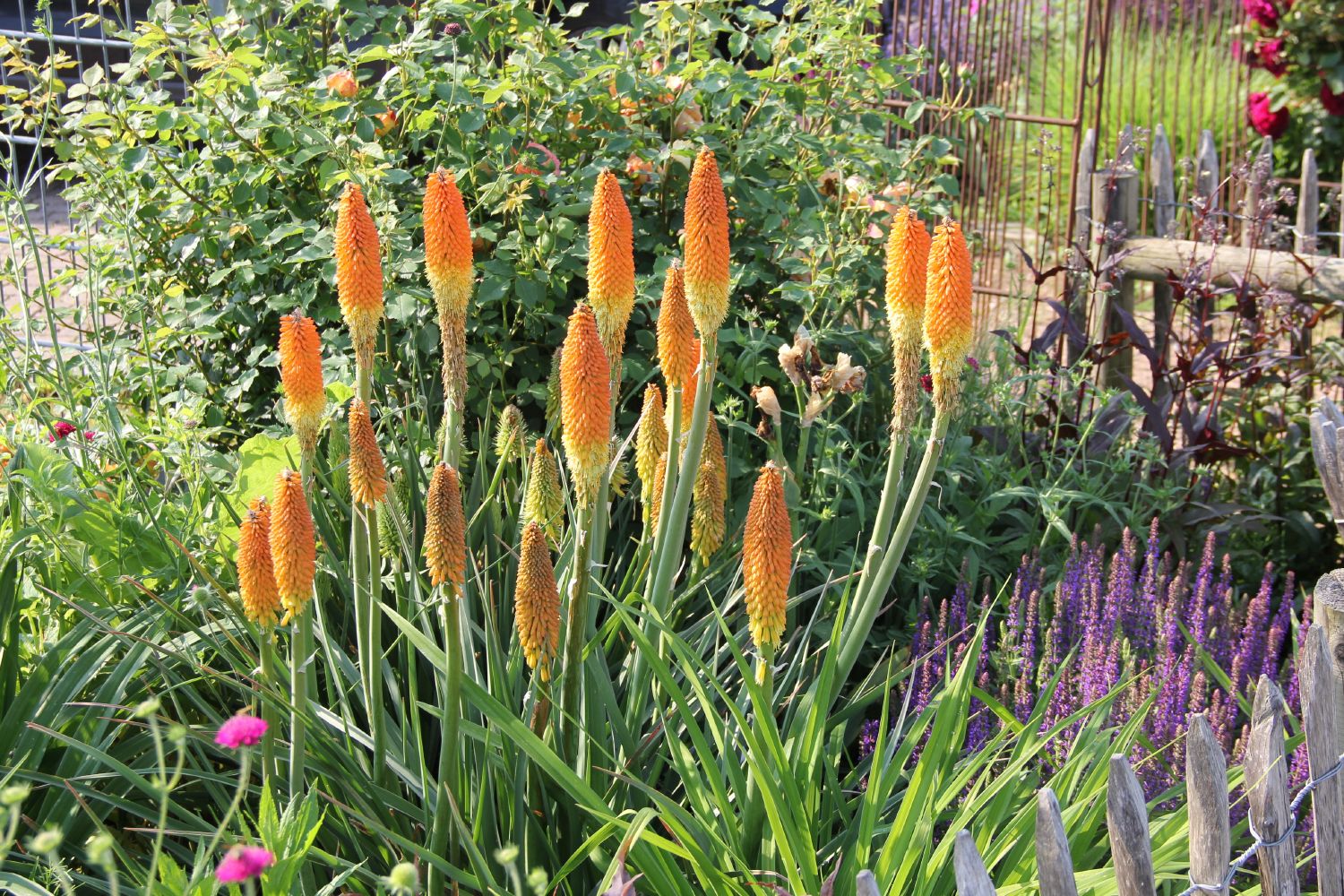 Kniphofia uvaria 'Alcazar' hat schlanke Blütenstände über schilfartigem Laub. In ungünstigen Lagen benötigen Fackellilien Winterschutz. Sie ist besonders schön in mediterranen Gärten.
