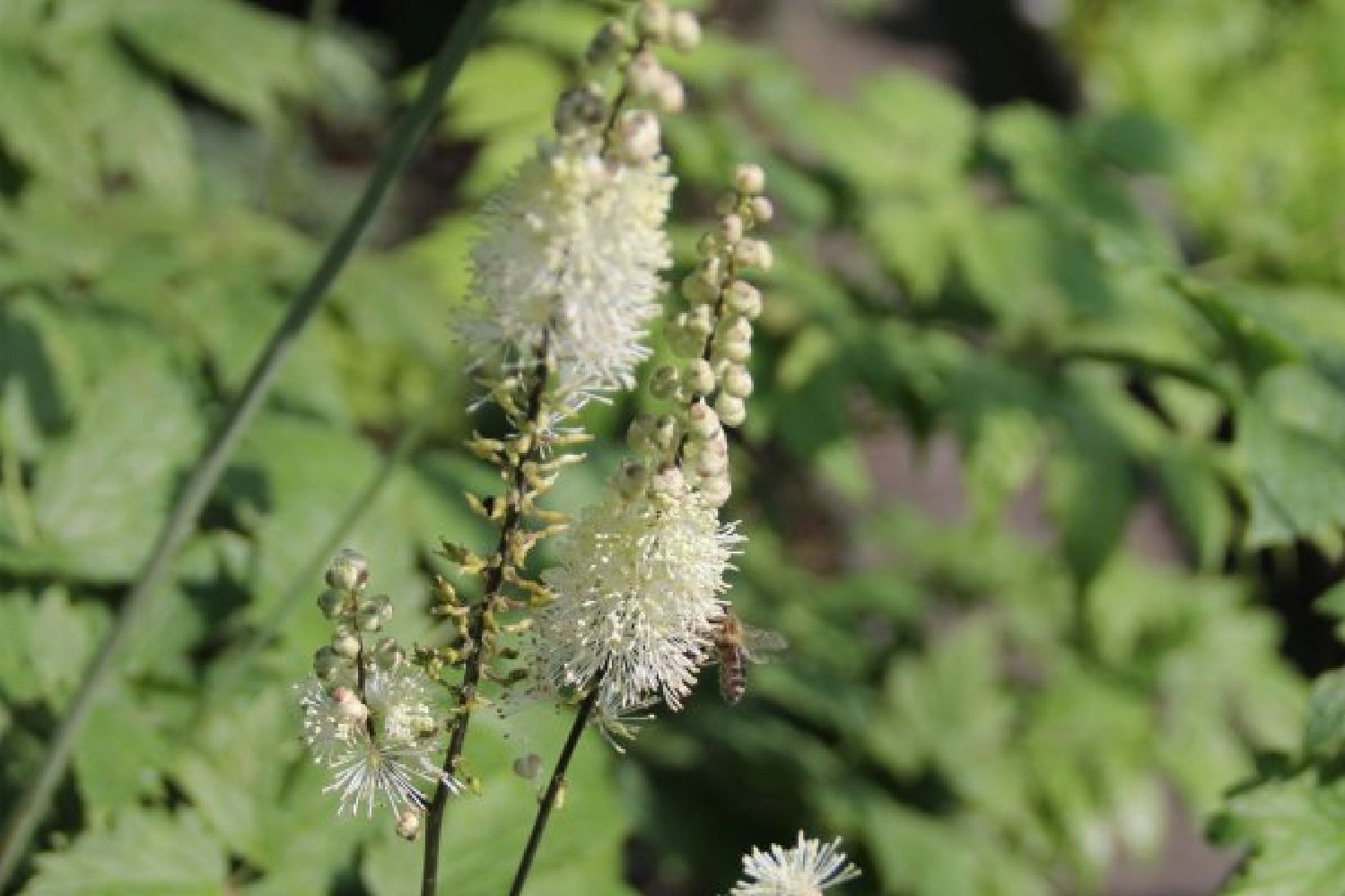 Ab Mai beginnt zarte, lilablaue Katzenminze zu blühen, die ab Juli von weißem Sonnenhut ergänzt wird. Ab August folgen die Fetthenne, die bereits im Sommer mit architektonischem Laub besticht, eine fröhliche Sonnenbraut in Goldorange und elegante, weiße Herbstanemonen. In keinem Herbstbeet dürfen jedoch Astern fehlen. Mit tausenden kleiner Blüten erfreuen im Beethintergrund eine hohe pinkrosafarbene Raublattaster, eine kräftig lilablaue Glattblattaster sowie eine weiße Myrtenaster bis Ende Oktober. Zwei niedrige Kissenastern in Blau und Magenta sorgen derweil im Beetvordergrund für Farbe. Aus diesem Blütenreigen erhebt sich ab September die Silberkerze mit schlanken, weißlich-zartrosa Blütenkerzen auf hohen Stängeln. Wie kleine Feuerwerke leuchten sie dabei über dem Beetensemble und sind zusammen mit den weißen Blüten des Sonnenhuts, den Herbstanemonen und der Myrtenaster auch in der Dämmerung noch lange zu sehen. Ein weiterer Bonus dieser Blütenstauden, sie werden als späte Nektarquellen liebend gern von Bienen, Hummeln und Schmetterlingen angeflogen und sorgen für reges Summen und Brummen im Beet.